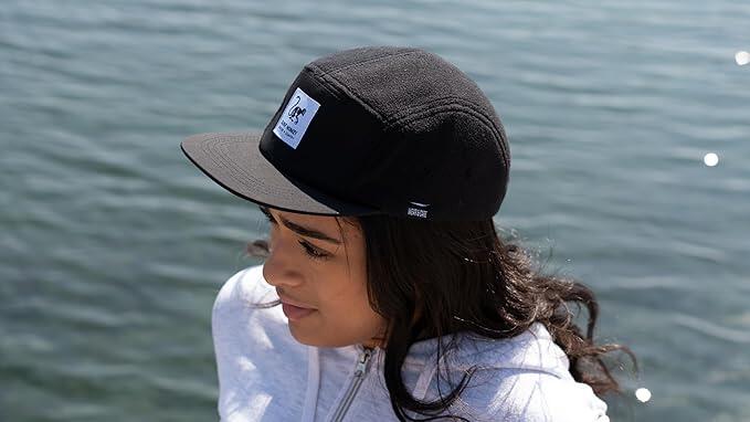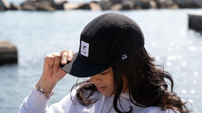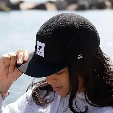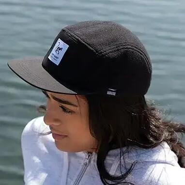 5-panel recycled sherpa cap with waterproof front. Custom fit, embroidered label, and stitched eyelets for breathability. Ideal for outdoor activities and urban look.