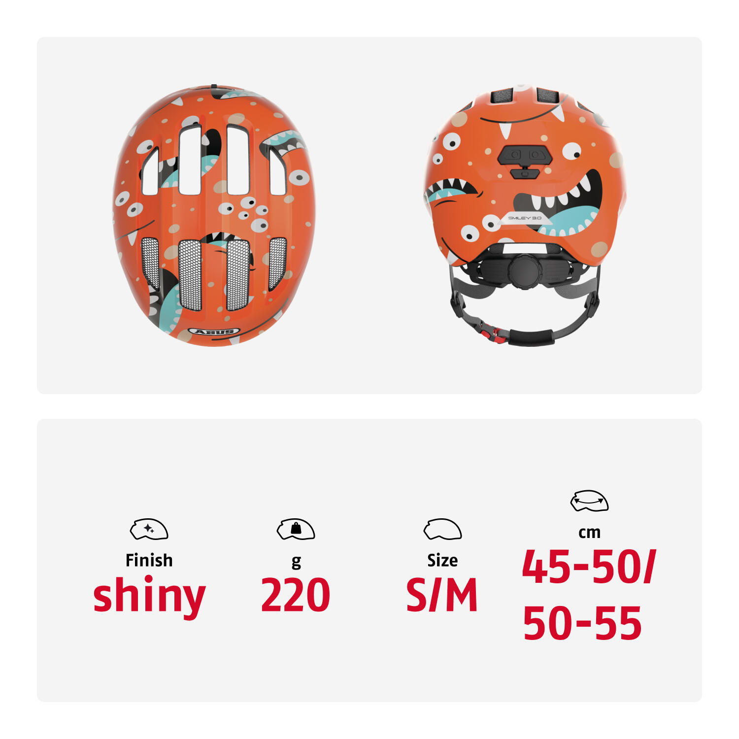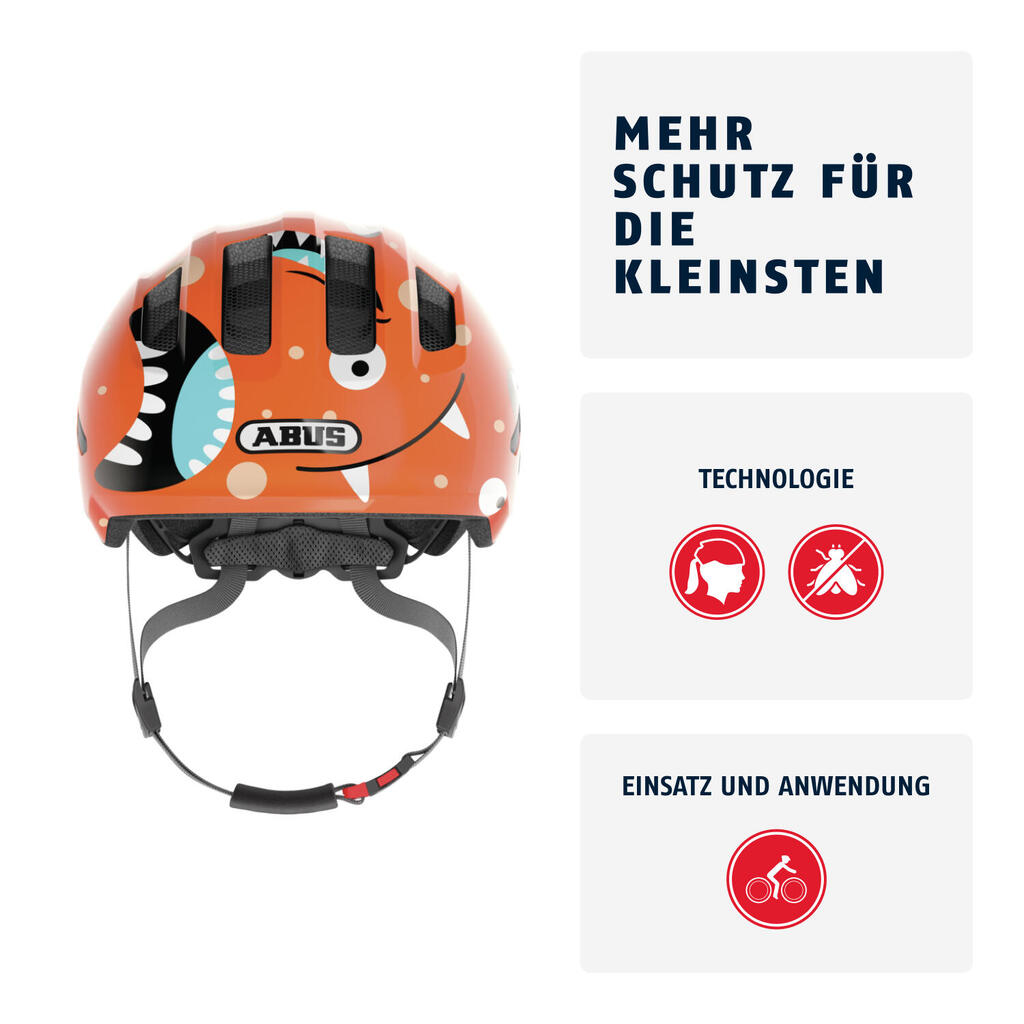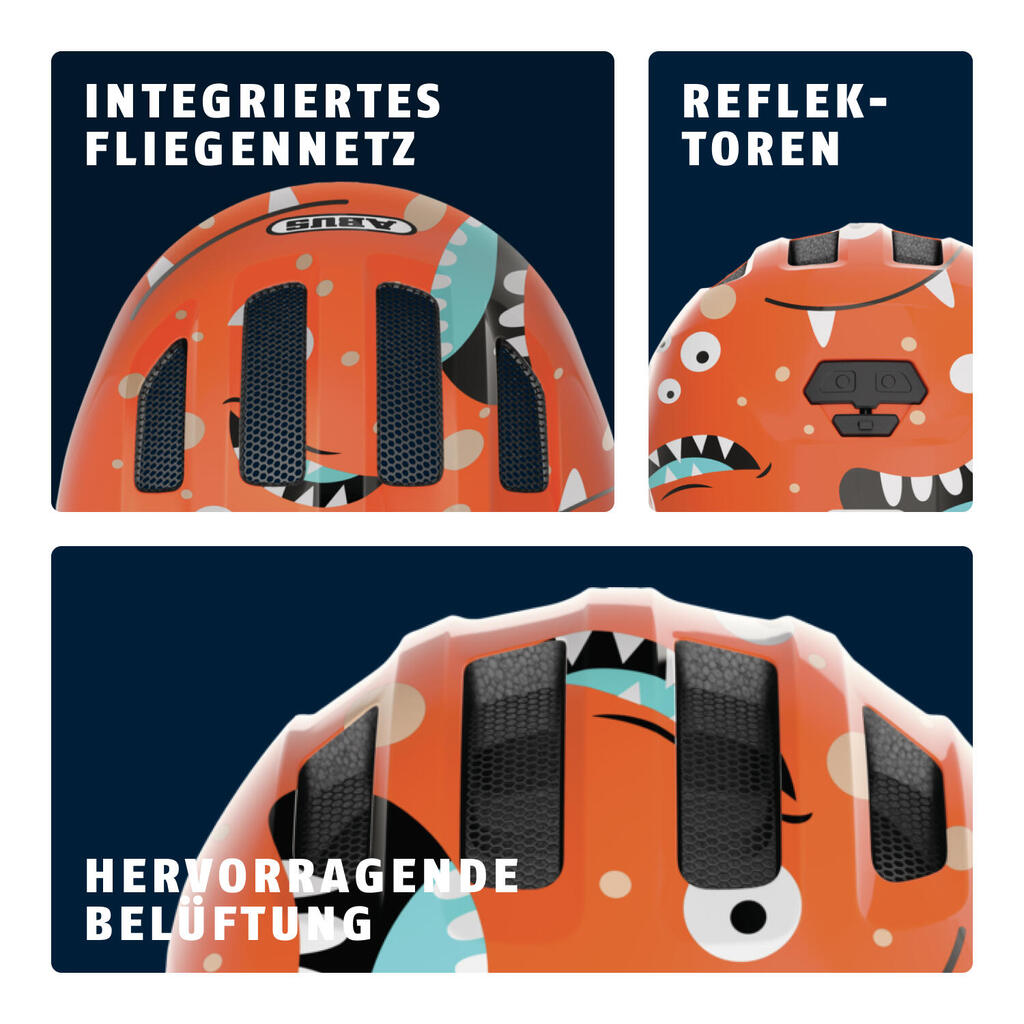 MORE PROTECTION FOR LITTLE ONES Our best-selling children's helmet just got even better! With a completely redesigned exterior and adapted features, the Smiley 3.0 enters a new era. The popular children's helmet accompanies kids on their first trials, whether on a racing bike, a tricycle or their very own premier bike. The deep fit and visor-like front edge offer extra protection for the child's head. The helmet can be easily adapted to the size of the head thanks to the height adjustment system - both in width and in height at the back of the head. The height-adjustment system offers another advantage for children with long hair. Because it can make room for a braid. No more annoying pressure from the adjustment knob on the ponytail. The comfort of port is also enhanced by a thick chin strap. With 16 different decors, choosing the Smiley 3.0 that should be part of your family is no easy task. The glossy helmets are available in kid-friendly designs as well as solid colors. With so much to choose from, there's something for every boy and girl. - In-Mold for permanent connection of the outer shell to the shock-absorbing helmet material (EPS) - Helmet extends to the temples and nape of the neck for better overall protection - Height-adjustment system with ponytail compatibility for riders with long hair - Zoom Ace Kids - height-adjustment system with non-slip adjustment wheel at the back of the head - Size adjustment by means of a robust, flexible plastic ring for optimum stability and adaptability - Excellent ventilation with 4 air inlets and 4 air outlets - Removable, washable padding for maximum comfort - Integrated mosquito net - Passive safety thanks to reflectors