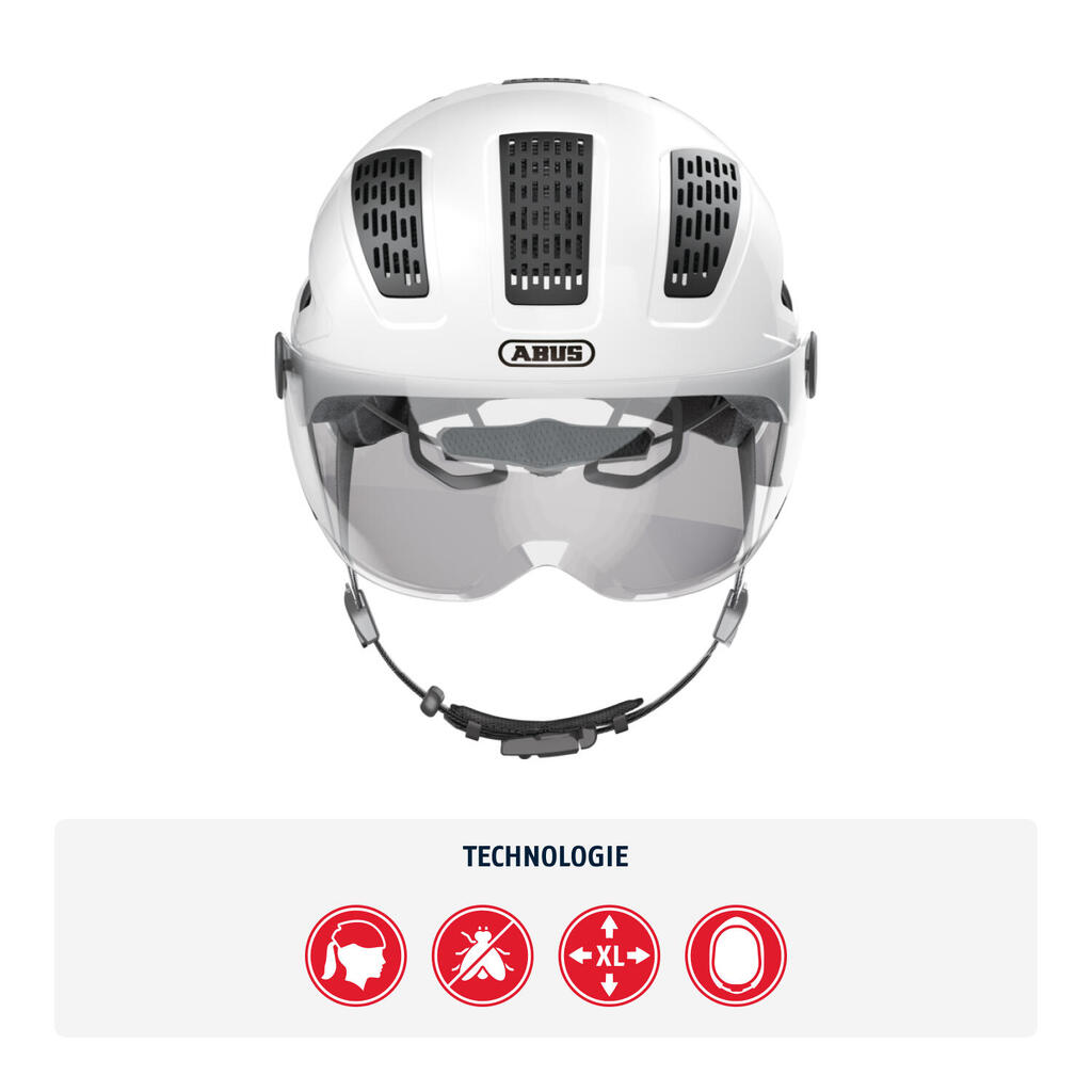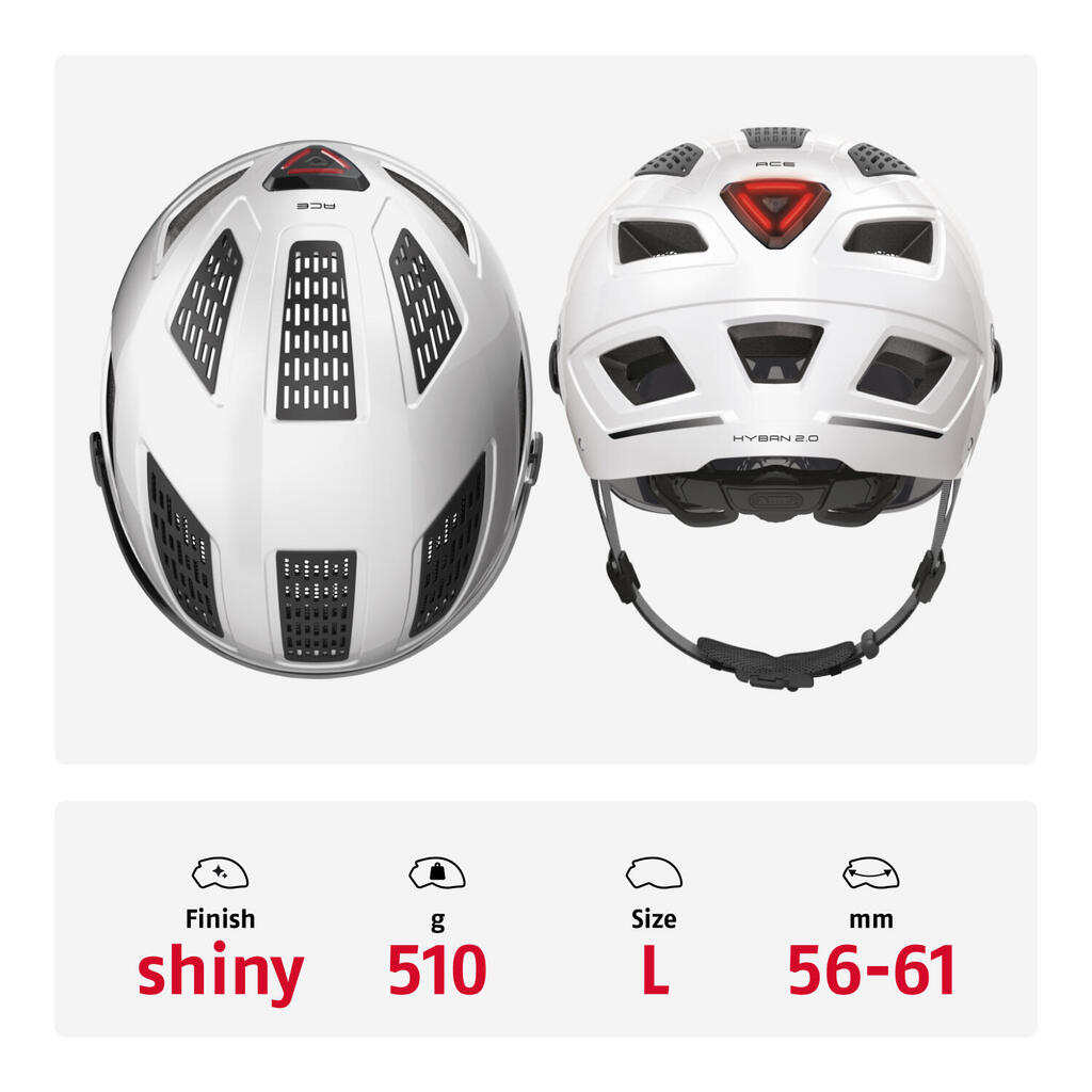 With theHyban 2.0 ACE fromABUS, you won't be bothered by cold wind and unwanted insects. Simply pull down the wide outer visor and enjoy a clear view without wind in your eyes. The integrated grilles on the top of the helmet, which can be removed or changed in color, further protect the head from cold wind, rain and insects. Technical features: - ABS hard shell: Rugged EPS helmet with molded outer shell. - High visibility thanks to its reflectors - Mosquito net: Full protection against insects - Ponytail compatible: Helmet that is perfect for people with long hair - Full band: Adjustable band around the entire head, connected to the tightening system - XL size: Large size helmets available (62+ cm) - Highly efficient ventilation with 5 air inlets and 8 outlets - Zoom Ace Urban: finely adjustable system with handy thumbwheel for a custom fit - Large integrated LED light for 180° visibility - Fidlock magnetic strap buckle Features: - Gender Material EPS - ABS Matte Finish Year 2020