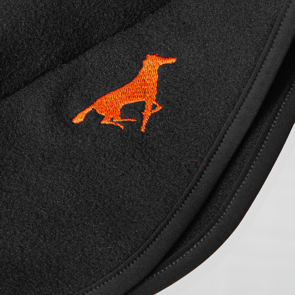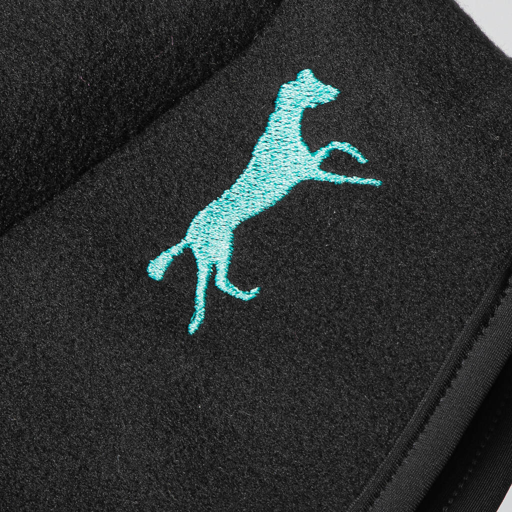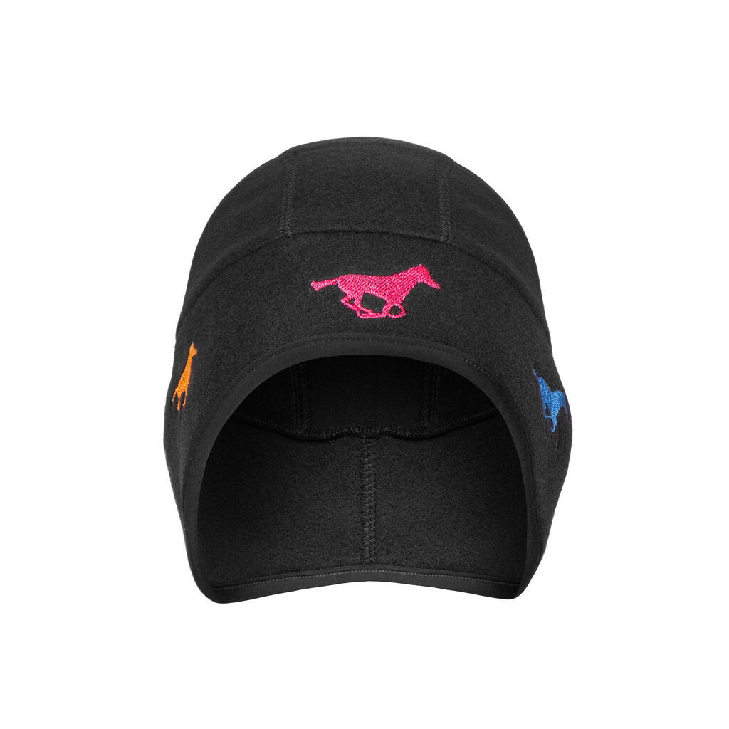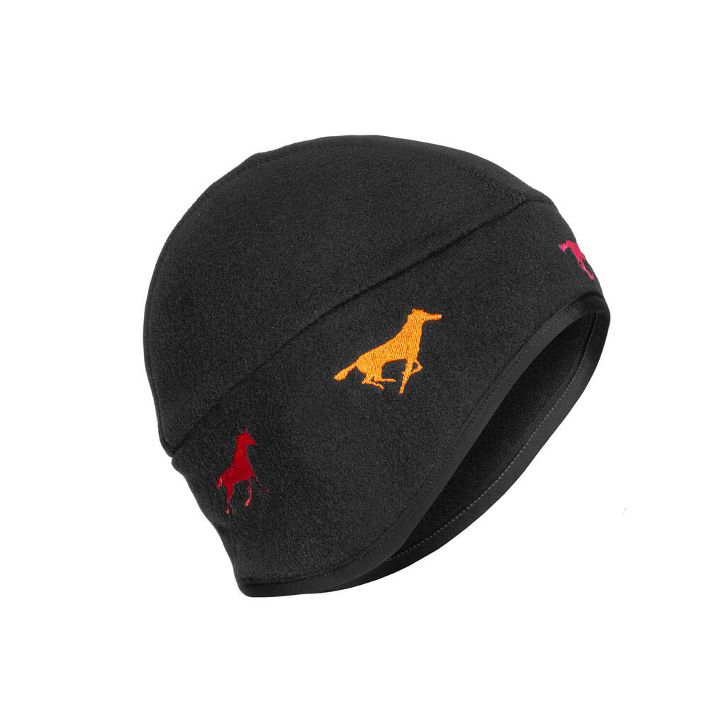 Warm fleece helmet liner cap with ear coverage and elastic trim – fits under any riding helmet, protects from wind and cold, and features subtle galloping horse embroidery.