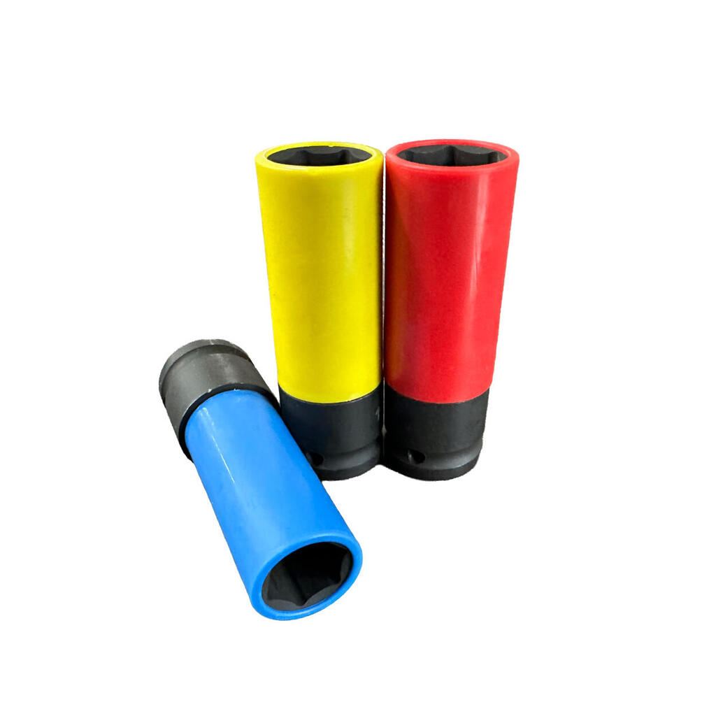The set comes with **three impact sockets (17 mm, 19 mm and 21 mm)**. The long, thin-walled design allows you to easily reach every wheel bolt, while the protective coating prevents scratches and damage. Each size has its own colour for quick recognition.
