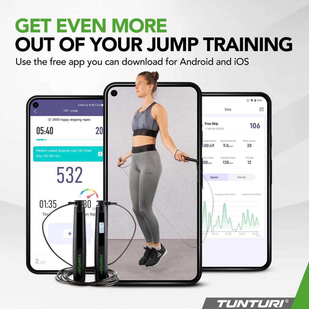 **Rope jumping is a great cardiovascular workout and also good for your bones and muscles. With the Tunturi Smart Jump Rope, with Bluetooth, 4 modes and free app, you will make the most of every jump. The LCD display gives you insight into your entire workout and with the free Skipjoy app, you'll never be short of motivation and inspiration. Losing weight with a jumping rope has never been easier!**