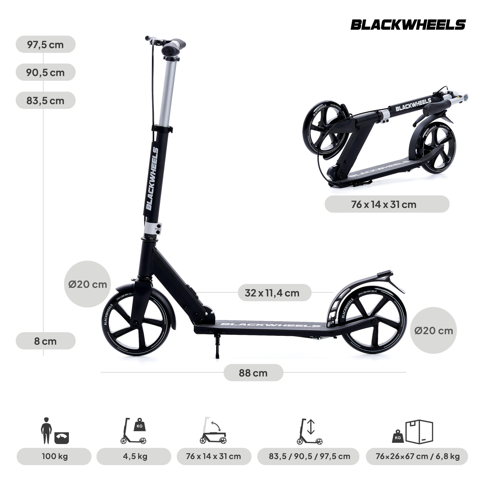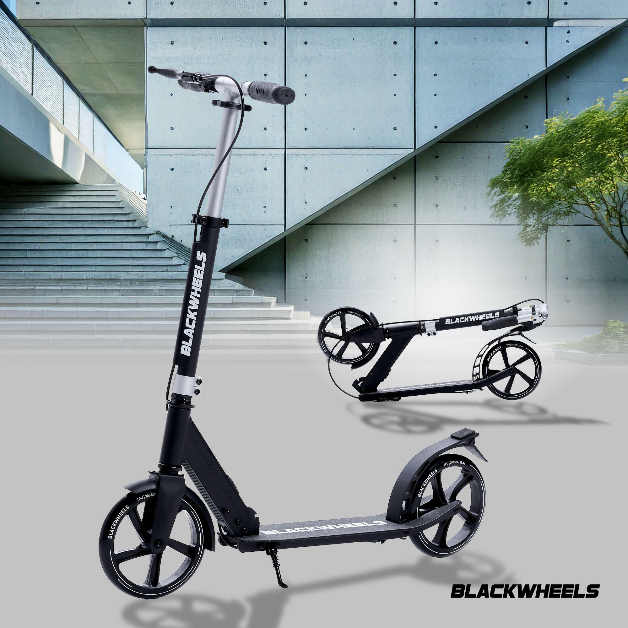 Blackwheels Orio – foldable aluminium city scooter with 200 mm wheels, dual braking system and adjustable handlebar. Perfect for commuting and leisure rides!