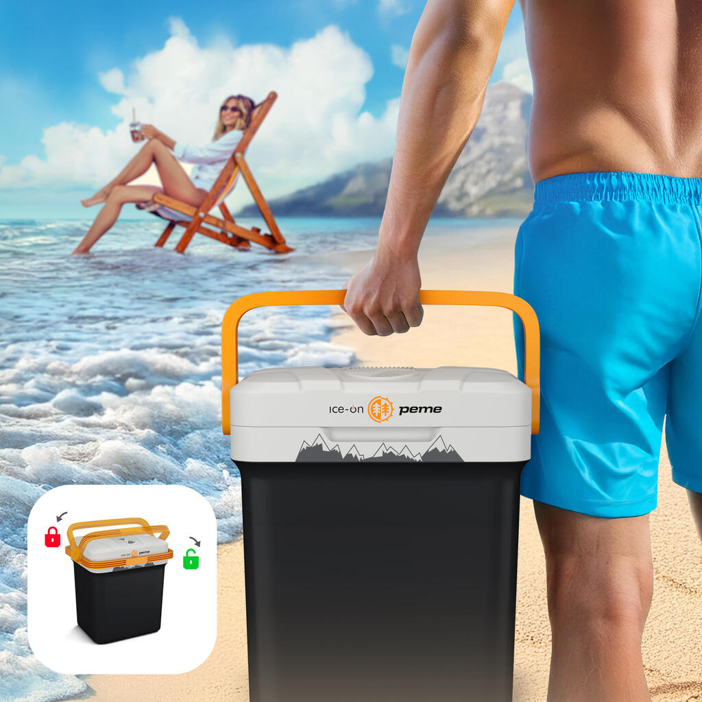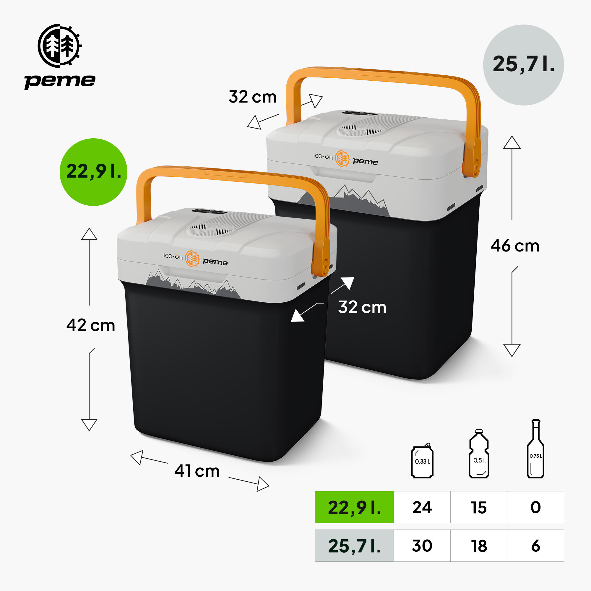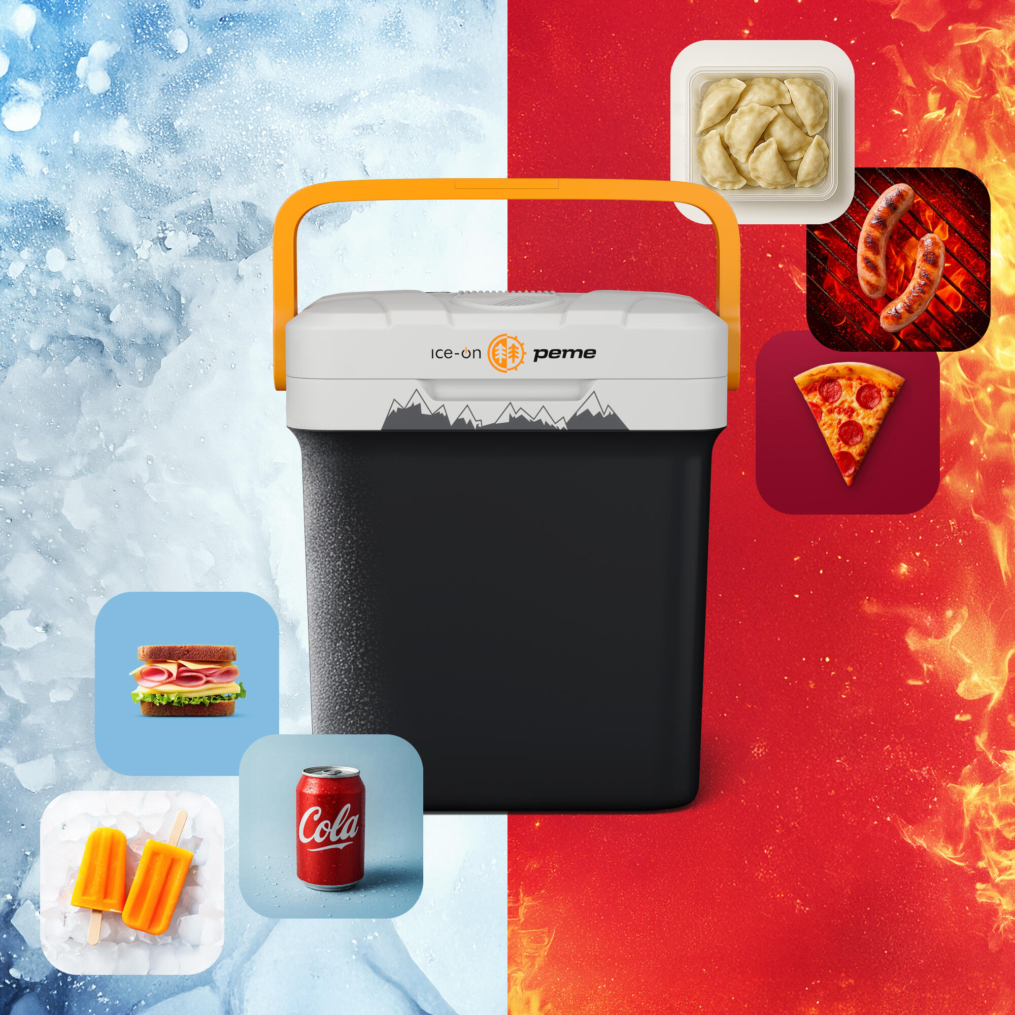 Peme Ice-on 27 – 22.9L thermo-electric cooler. Chills 14–18°C below ambient or keeps food warm at 60–65°C. AC/DC powered, USB charging – perfect for travel!