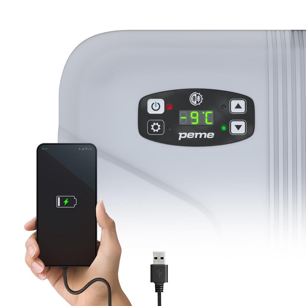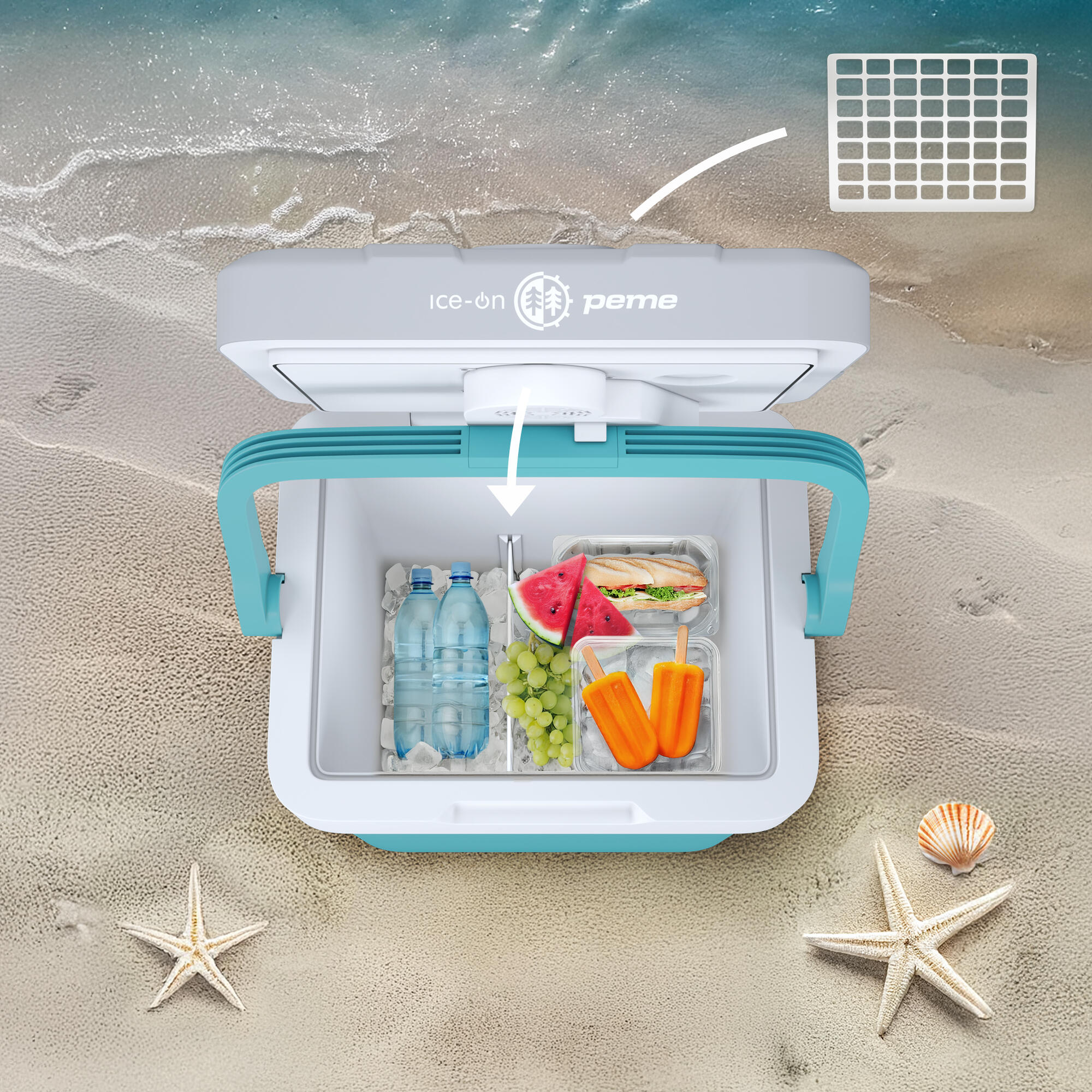 Peme Ice-on 27 – 22.9L thermo-electric cooler. Chills 14–18°C below ambient or keeps food warm at 60–65°C. AC/DC powered, USB charging – perfect for travel!