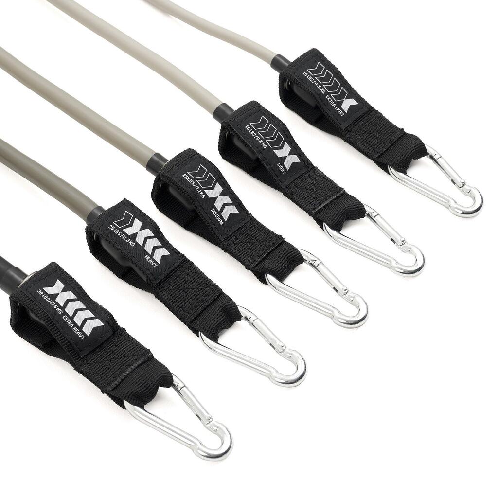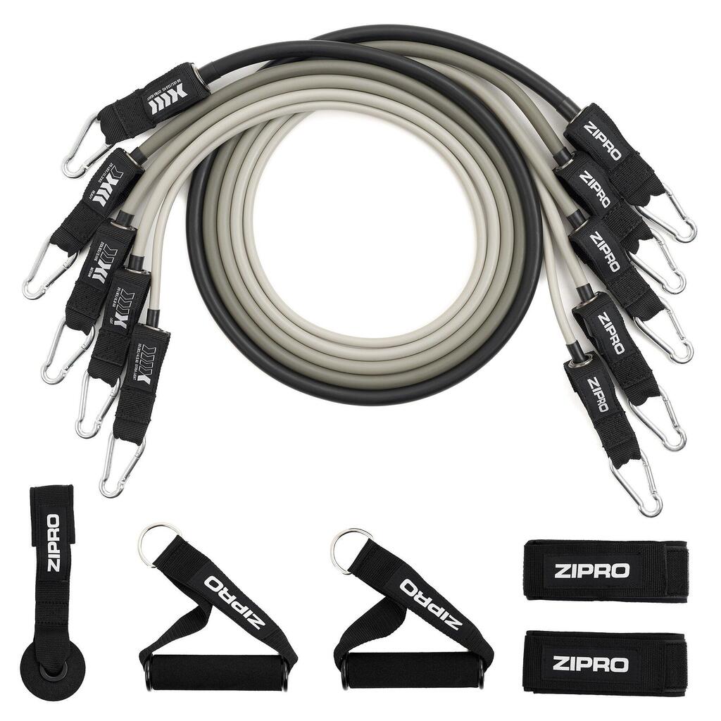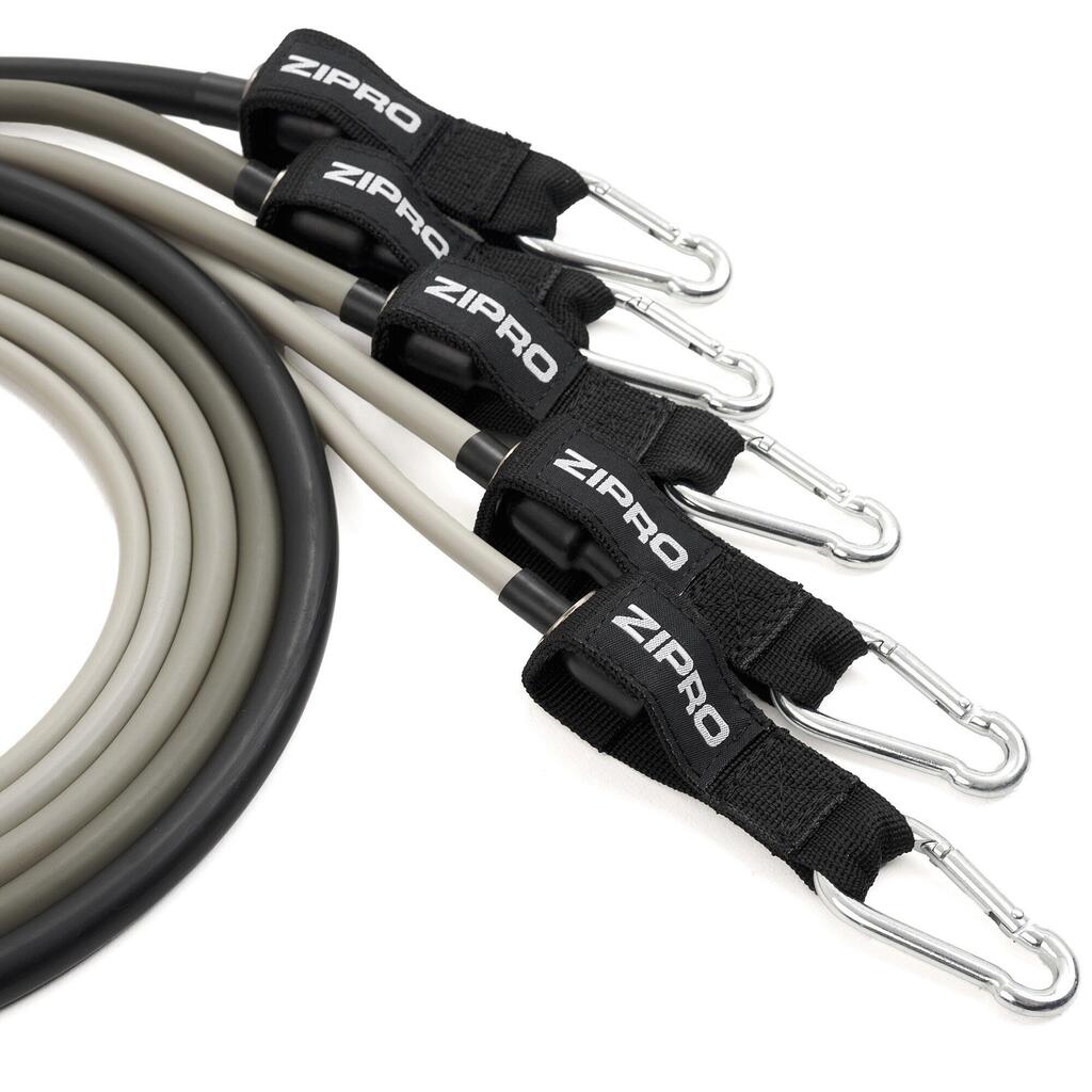 # **ZIPRO Resistance Tubes Set with Accessories (11 Pieces)** ### Resistance Tubes with Comfortable Handles and Full Accessory Kit for Strength and Functional Training Training with ZIPRO resistance tubes helps you build strength, tone muscles and improve overall fitness. Thanks to multiple accessories, the set can be used both at home and in the gym. Resistance tubes are an excellent alternative to machine workouts. With five bands offering different resistance levels, you can easily adapt the intensity of your exercises to your fitness level and training goals. - **Set contents: 5 tubes with different resistance levels** - **Dimensions and resistance (diameter Γ length):** - **X-Light:** 0.7 Γ 1220 mm, 1β2 kg (2β4 lbs) - **Light:** 0.9 Γ 1220 mm, 2β3 kg (4β6 lbs) - **Medium:** 10 Γ 1220 mm, 4.5β5.5 kg (10β12 lbs) - **Heavy:** 11 Γ 1220 mm, 7β10 kg (15β20 lbs) - **X-Heavy:** 12 Γ 1220 mm, 11.5β13.5 kg (25β30 lbs) - **Included accessories:** 5 resistance tubes, door anchor, 2 ankle straps with Velcro, 2 foam handles, storage bag - **Material:** PP, steel carabiners, foam handles, cotton straps - **Colour:** Shades of grey - **Transport dimensions:** 245 Γ 80 Γ 240 mm - **Weight:** 1 kg ---------- ### Maximise Your Training with ZIPRO Resistance Tubes Expand your training options and achieve better results with the ZIPRO Resistance Tubes Set. With resistance levels from 1 to 13.5 kg, you can precisely adjust training intensity to your needs. #### Progress with Different Resistance Levels Start with the lightest tube (X-Light) and gradually move up to the heaviest (X-Heavy) to build strength, endurance and flexibility step by step. - X-Light: 1β2 kg (2β4 lbs) - Light: 2β3 kg (4β6 lbs) - Medium: 4.5β5.5 kg (10β12 lbs) - Heavy: 7β10 kg (15β20 lbs) - X-Heavy: 11.5β13.5 kg (25β30 lbs) #### Suitable for All Types of Training Whether you prefer functional workouts or strength training, the ZIPRO Resistance Tubes are perfect for every fitness routine. With three types of grips, they allow a wide variety of exercises and target different muscle groups. Heavy-duty steel carabiners ensure safety and easy attachment of handles. - Door anchor for stable mounting - Two ankle straps with strong Velcro (330 Γ 55 mm with 140 mm strap) - Two comfortable foam handles (40 mm diameter, 140 mm length) #### Train Anywhere β At Home, Gym or On the Go Pack your tubes into the included storage bag and take them anywhere β gym, park or even on holiday. This set ensures training continuity wherever you are. - Perfect for warm-ups - Excellent for stretching the whole body - Ideal for both upper and lower body strength training