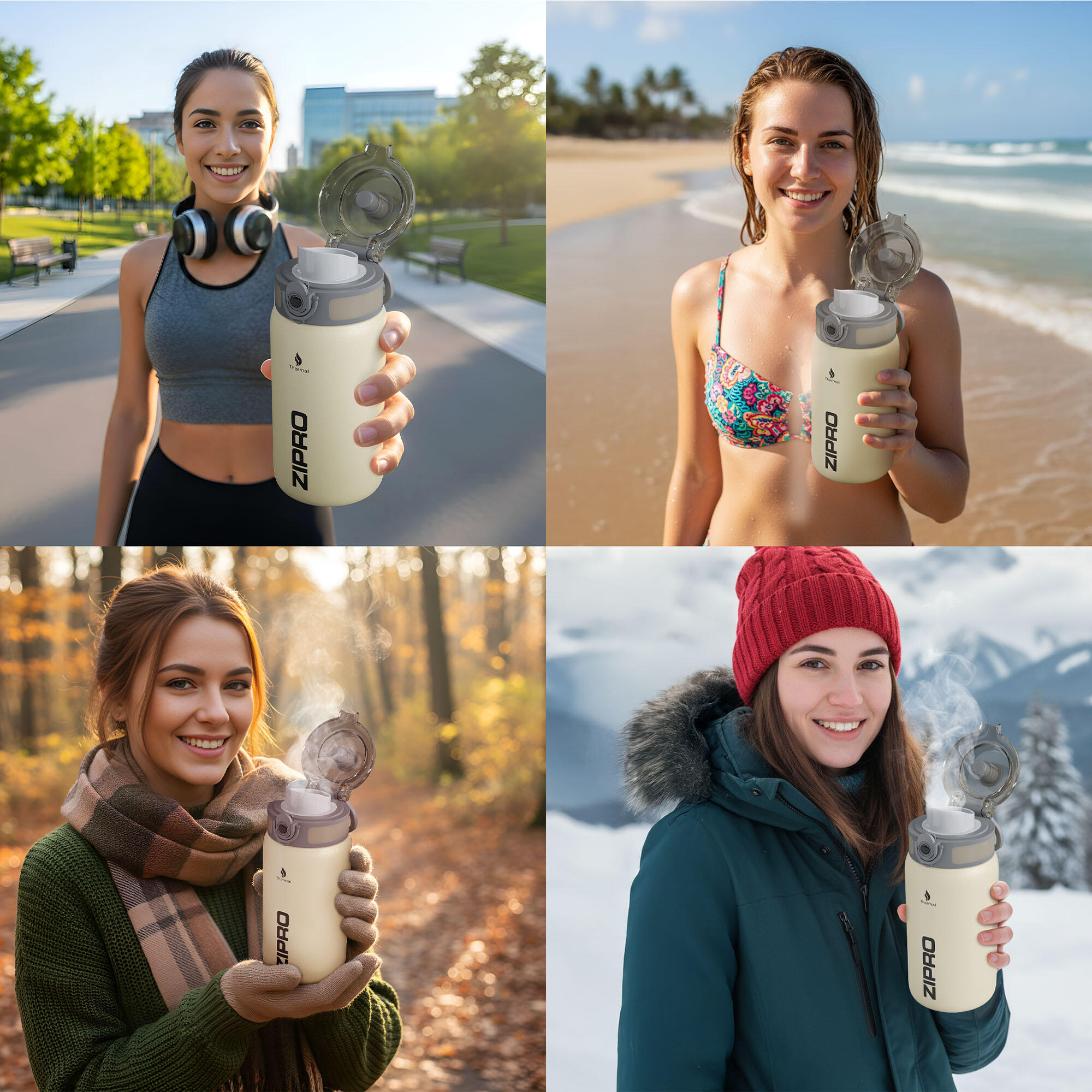 The ZIPRO bottle comes in three practical capacities – 500 ml, 700 ml and 1000 ml. Choose the size that best suits your lifestyle: the smaller one works great as a morning coffee cup, the medium is ideal for the gym, and the largest is perfect for long trips or outdoor adventures. You can also choose between two universal colours – elegant black and subtle beige. Whichever you pick, you get a functional thermal bottle that combines modern design with practicality.