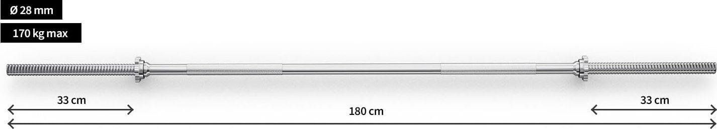 Zipro Straight Bar 180 cm Ø28 mm – chrome steel, max load 170 kg. Durable and versatile barbell for home strength training.