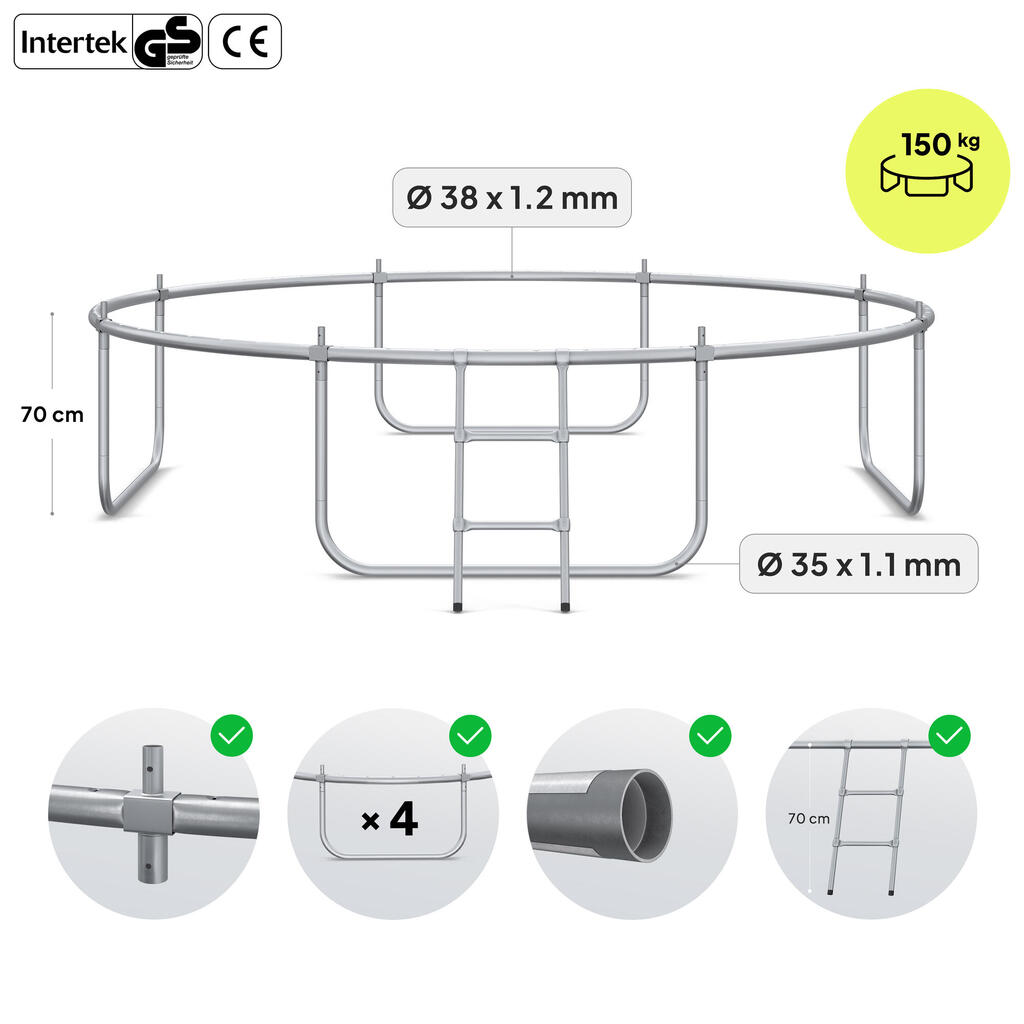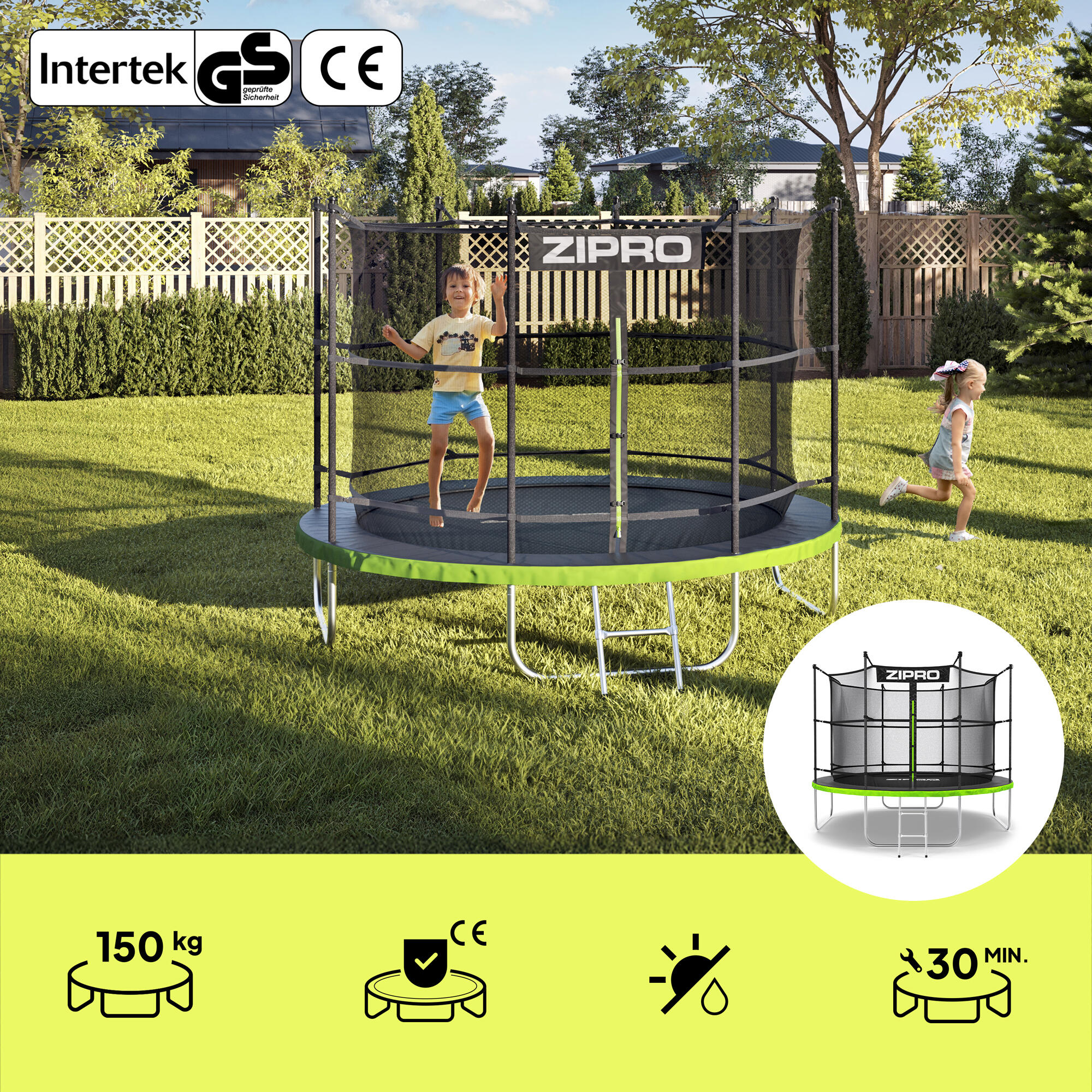 ZIPRO JumpPro IN 10′ trampoline with 150 kg capacity, CROSS-SECTION system, safety net, foam-covered poles, weather resistance, and stable steel frame for safe family fun.