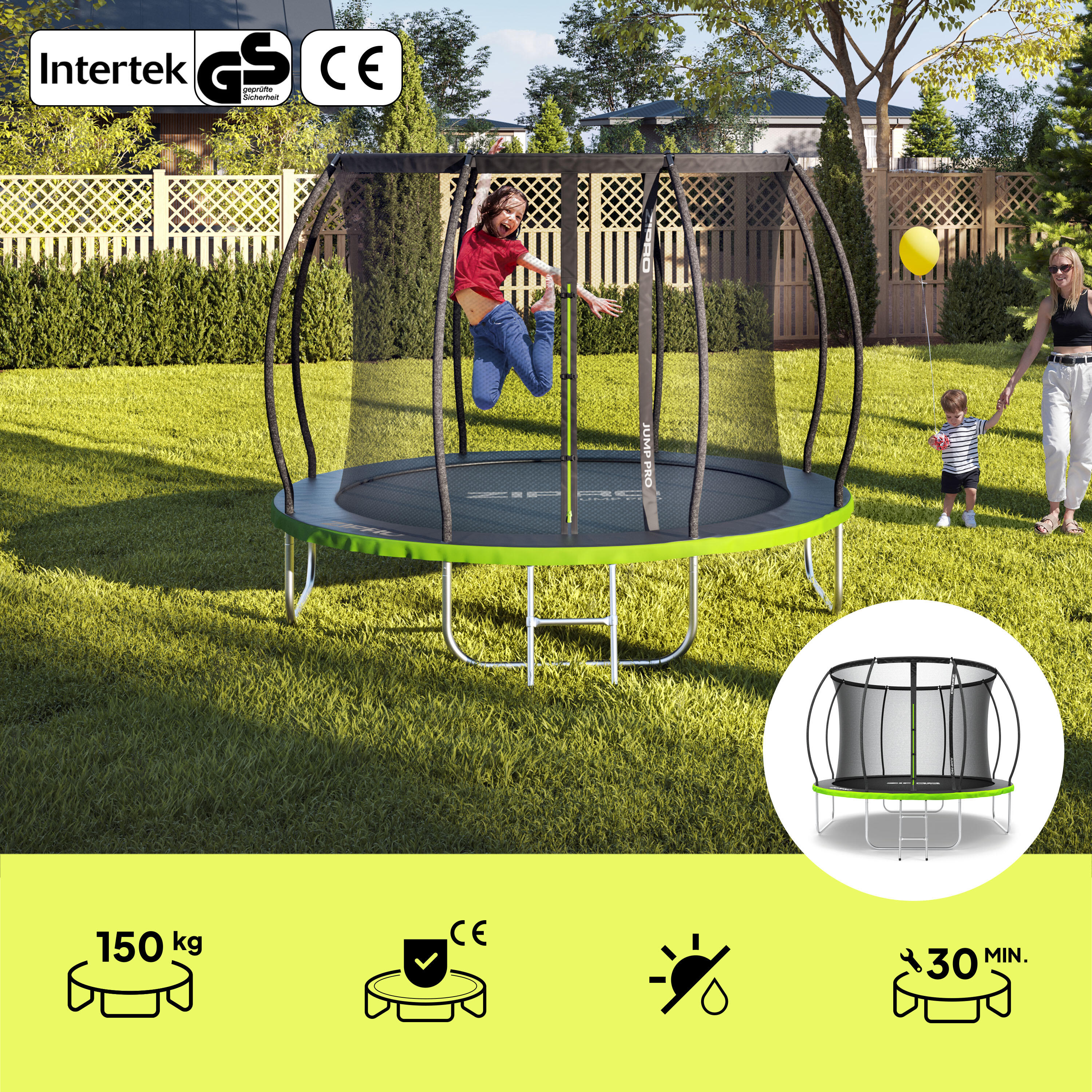 Premium garden trampoline with curved poles, reinforced safety net, 150 kg capacity, and CROSS-SECTION system for safe, stable, and quick setup.