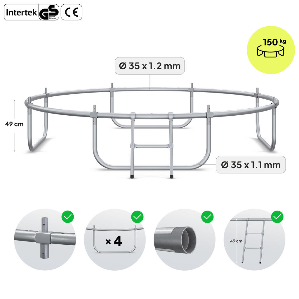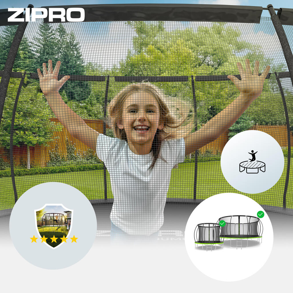 The ZIPRO JumpPro PREMIUM 8′ trampoline combines safety and fun with curved poles, reinforced mesh, steel frame, UV resistance, quick assembly, and 150 kg load capacity.