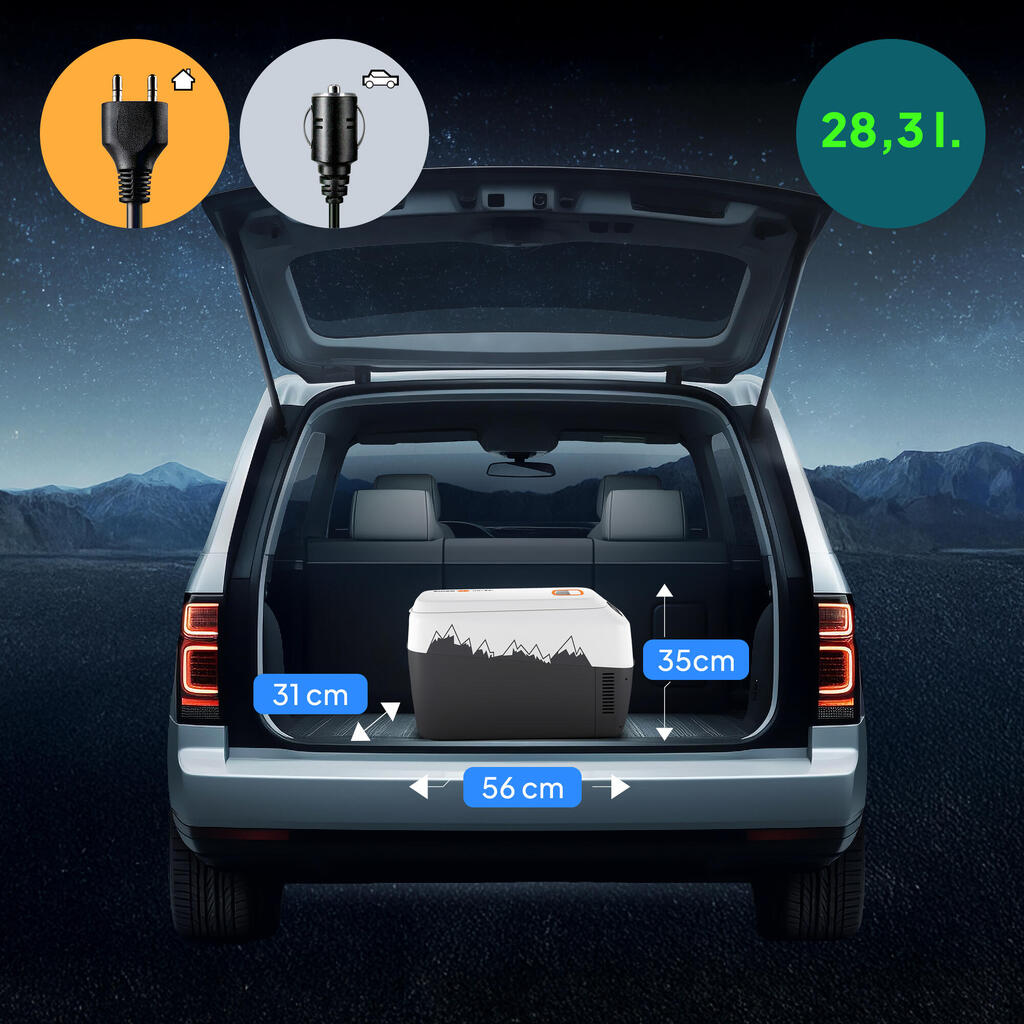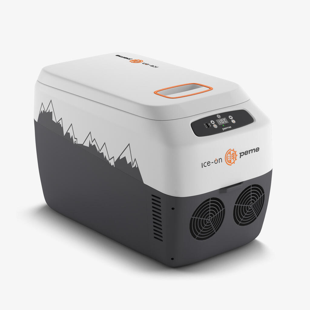 Peme Ice On – spacious 27.6L thermo-electric cooler with heating & cooling, dual power (12V/230V), USB charging and shoulder strap. Perfect for camping and road trips!
