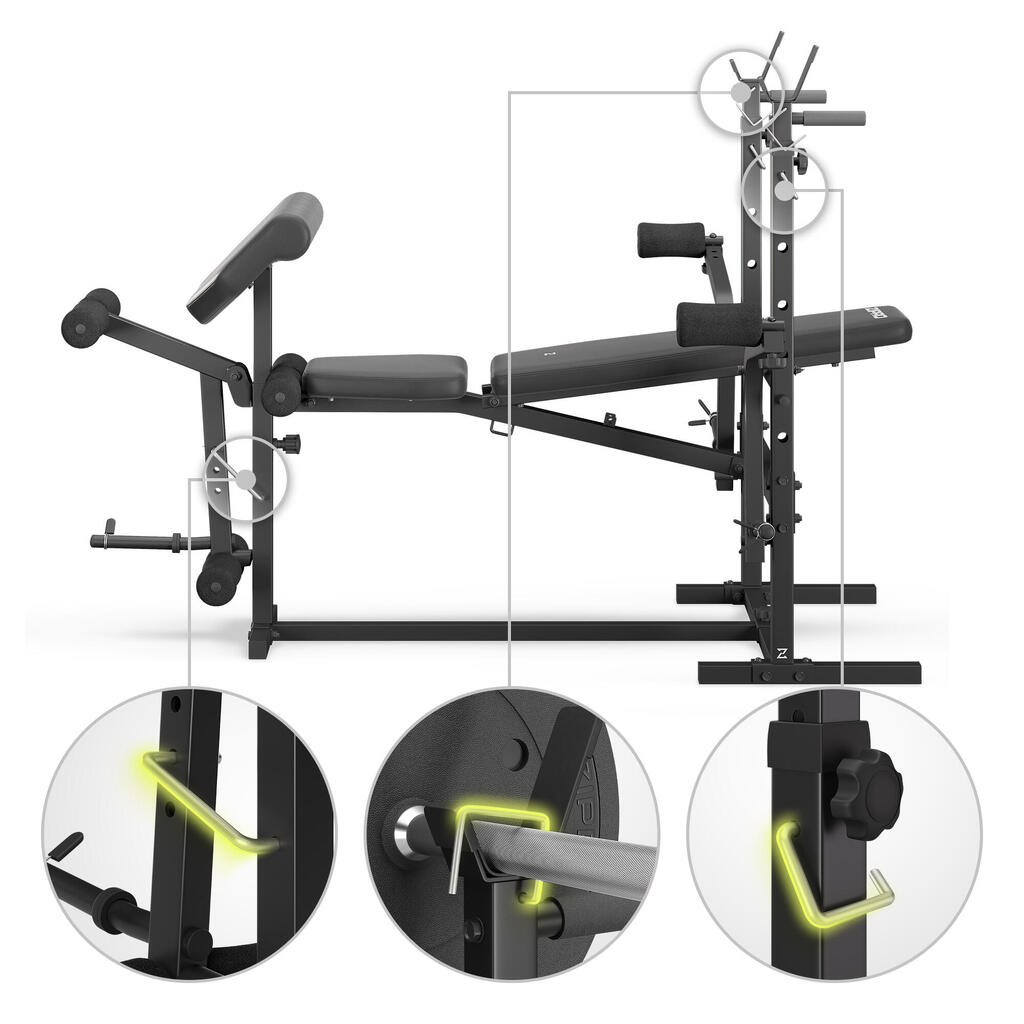 - **All-in-one design:** Bench press, preacher curls, leg developer, flyes, and dips in one unit.