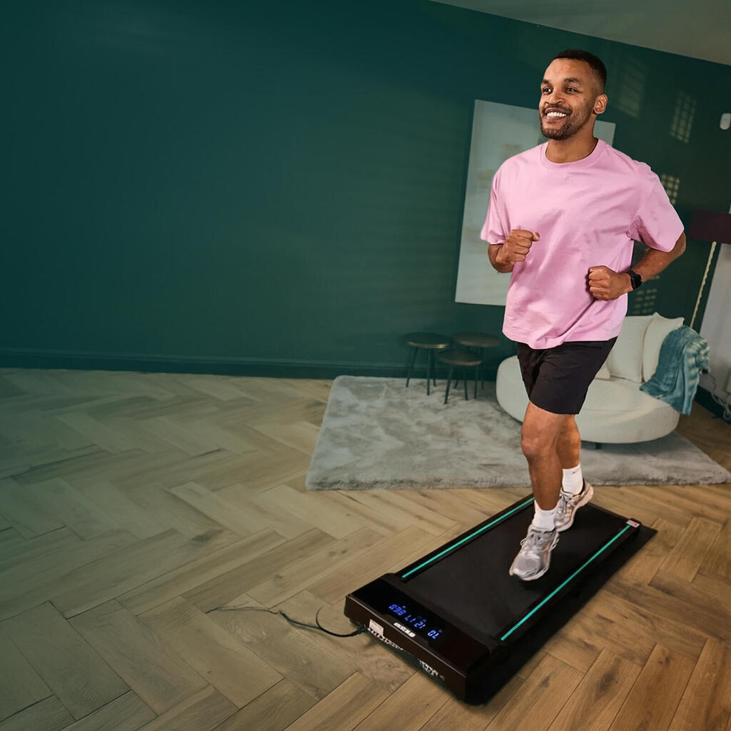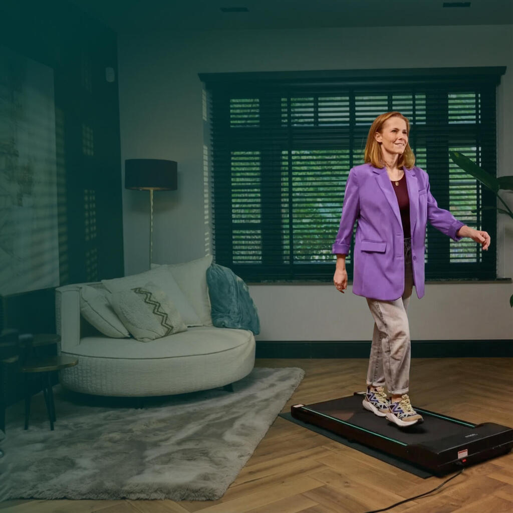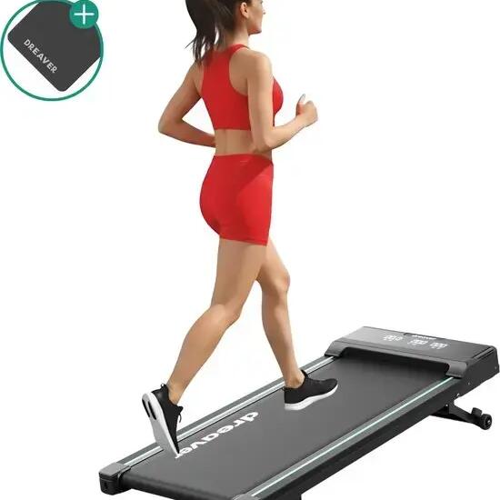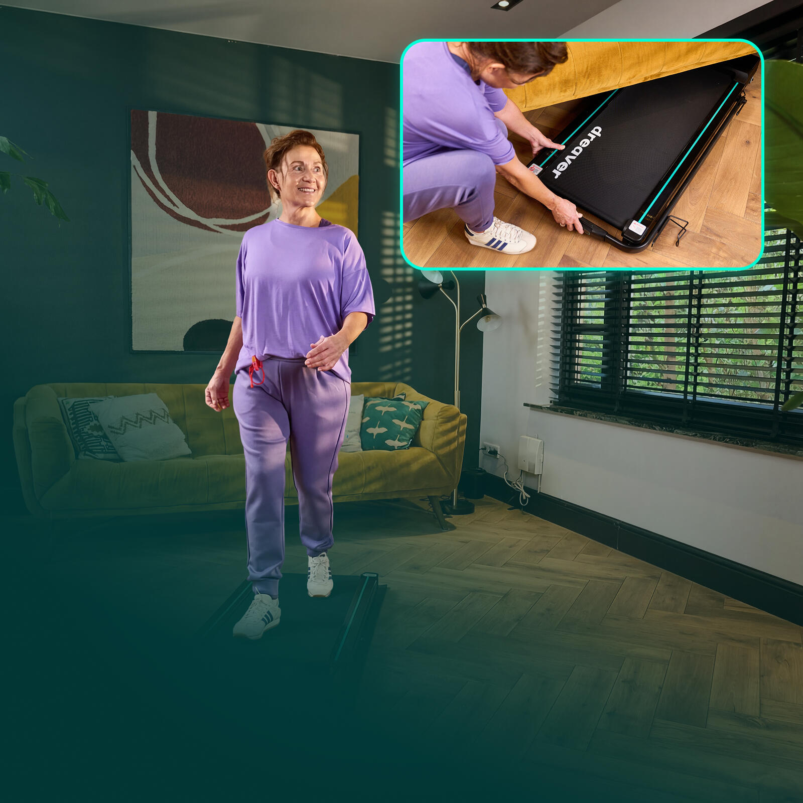 The Dreaver Elevate One is a compact and quiet walking and training treadmill for home use. With a speed of up to 6 km/h and an adjustable incline of up to 9%, it adds extra challenge to your walking workouts. Thanks to its foldable design, it is easy to store in small spaces such as under a sofa or desk. The treadmill is ready to use straight out of the box with no assembly required, allowing you to start moving immediately. Your benefits Maximum walking speed up to 6 km/h for daily walking Adjustable incline up to 9% for more intensive walking sessions Compact and foldable design to save space Ready to use immediately with no assembly Built-in step counter and pause button Sturdy construction with a maximum user weight of 135 kg Included accessories Protective floor mat Comfortable daily walking The Dreaver Elevate One offers a comfortable walking experience at speeds up to 6 km/h, making it easy to reach your daily step goals. This speed is ideal for everyday use during work, breaks, or relaxation. You stay active without needing to set aside time for the gym. It’s an accessible way to improve your overall health. Adjustable incline up to 9% With the incline function up to 9%, you can increase the intensity of your walk without additional outdoor effort. This helps burn more calories and engage your muscles more effectively. The incline can be adjusted to your preference for a varied workout, making the Elevate One more than just a basic walking treadmill. Compact and space-saving design Thanks to its low-profile and foldable design, the Elevate One can be easily stored out of sight after use. Slide it under your sofa, bed, or desk to keep your living space uncluttered. This makes it ideal for apartments and smaller homes, without the need for a dedicated fitness area. Ready to use The treadmill is delivered fully ready for use, with no assembly required. Simply plug it in and start walking right away. No tools, no manuals, no hassle—so you can focus on staying active. Integrated training features The Elevate One features a built-in step counter, allowing you to track your progress without extra apps or devices. The pause button makes it easy to stop and resume your workout at any time, ensuring a user-friendly experience.