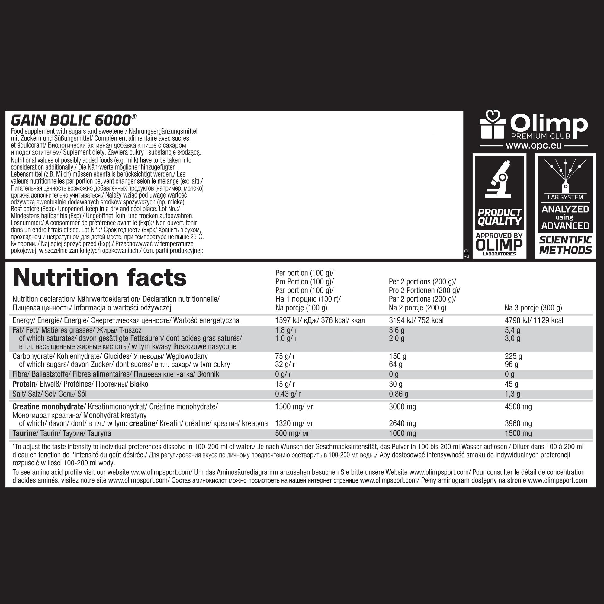 Gainer Recuperador Gain Bolic 6000 with 6800g from Olimp Nutrition This is a formula of Hydrates and Whey Protein, both with Progressive Absorption, enriched with Creatine and Taurine. With Taurine The various types of whey and hydrates, aim to immediately and continuously for several hours, replenish energy stores and provide amino acids to develop an anabolic state of development of physical capacity. Progressive Absorption Rich in carbohydrates with different glycemic indexes, for a progressive assimilation (maltodextrin and dextrose). Enriched with 3 different sources of whey protein for muscle regeneration. Optimal Recovery Formula - Also for Endurance Sports This formula allows for a quick generation of energy stores after training. Essential method in the recovery process in Endurance Sports. It can also be used to increase calories in the diet (hypercaloric diet), very used by bodybuilders. Boosts muscle volume If you add creatine monohydrate, it's great for building muscle. In this case, add 3 to 5 grams of creatine monohydrate to 50 to 70 grams of Gain Bolic 6000, mix with water and drink 3 to 4 times a day.