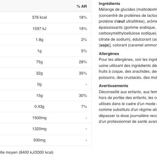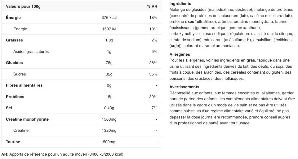 Nutritional information One dose : 100g Per dose%AJR* Calories 376kcal Fat 1,8g of which saturated fatty acids 1g Carbohydrates 75g of which sugar 32g Dietary fiber 0g Protein 15g Sodium 0,43g L-arginine 0,35g L-histidine 0,31g L-isoleucine (BCAA) 0,68g L-leucine (BCAA) 1,25g L-lysine 1,3g L-methionine 0,24g L-phenylalanine 0.72g L-threonine 0.75g L-tryptophan 0.18g L-valine (BCAA) 0.85g Aspartic acid 1.57g L-cysteine 0.116g Glutamic acid 2.47g L-glycine 0.34g L-proline 1.1g L-serine 0.84g L-tyrosine 0.81g Creatine 1.5g L-alanine 0.66g Taurine 500mg *RDA not determined