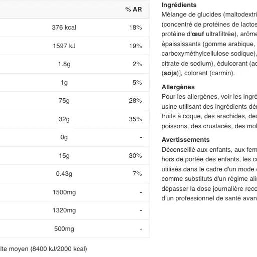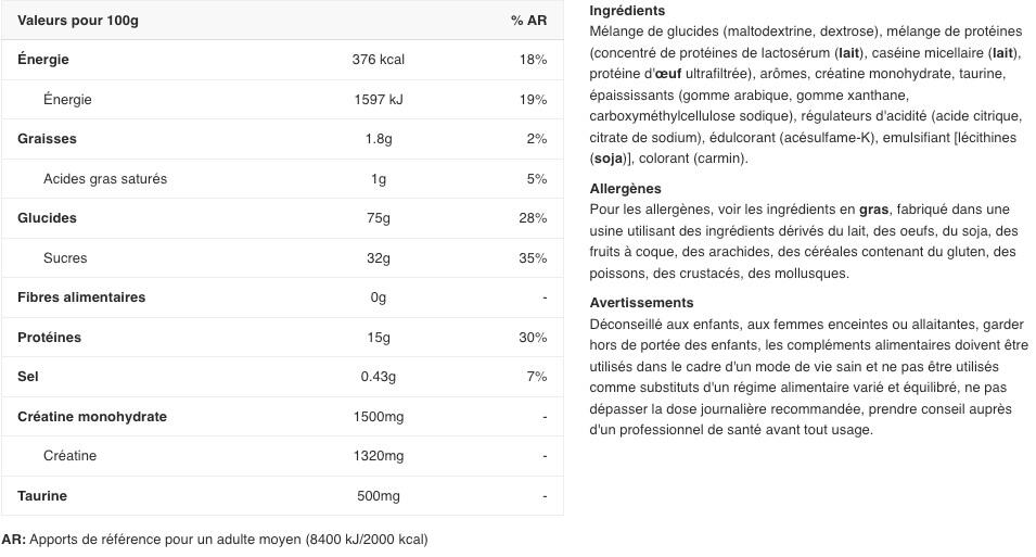 80% carbohydrate blend (maltodextrins, dextrose), 15.5% protein blend (whey protein concentrate (from milk), micellar casein (from milk), ultrafiltered egg protein ), flavors , taurine, thickeners gum arabic, xanthan gum, sodium carboxymethyl cellulose; acidity regulators citric acid, sodium citrates; sweetener acesulfame K; emulsifier lecithins (from soy); colors: (...)
