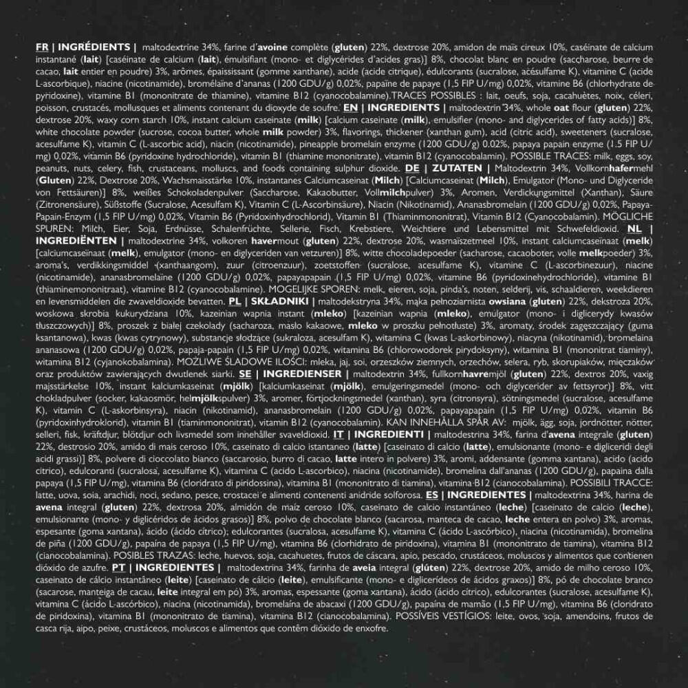 Ingredients Vanilla : maltodextrin 34%, wholemeal oat flour (gluten) 24%, dextrose 20%, waxy corn starch 10%, instant calcium caseinate (milk) [caséinate de calcium (lait), émulsifiant (mono- et diglycérides d?acides gras)] 8%, flavourings, yoghurt powder (milk), thickener (xanthan gum), sweeteners (sucralose, acesulfame K), vitamin C (L-ascorbic acid), niacin (nicotinamide), pineapple bromelain (1200 GDU/g) 0.02%, papaya papain (1.5 FIP U/mg) 0.02%, vitamin B6 (pyridoxine hydrochloride), vitamin B1 (thiamine mononitrate), vitamin B12 (cyanocobalamin). Certified anti-doping, soy-free, GMO-free, pesticide residue-free and Halal.Chocolate ingredients : maltodextrin 34%, whole oat flour (gluten) 20%, dextrose 20%, waxy corn starch 10%, instant calcium caseinate (milk) [caséinate de calcium (lait), émulsifiant (mono- et diglycérides d?acides gras)] 8%, defatted cocoa powder 5%, flavourings, thickener (xanthan gum), sweeteners (sucralose, acesulfame K), vitamin C (L-ascorbic acid), niacin (nicotinamide), pineapple bromelain (1200 GDU/g) 0.02%, papaya papain (1.5 FIP U/mg) 0.02%, vitamin B6 (pyridoxine hydrochloride), vitamin B1 (thiamine mononitrate), vitamin B12 (cyanocobalamin). Certified anti-doping, soy-free, GMO-free, pesticide residue-free and Halal.Ingredients Strawberry: Ingredients Strawberry yoghurt : maltodextrin 34%, wholegrain oat flour (gluten) 25%, dextrose 20%, waxy corn starch 10%, instant calcium caseinate (milk) [caséinate de calcium (lait), émulsifiant (mono- et diglycérides d?acides gras)] 8%, flavourings, beet concentrate powder [maltodextrine, concentré de betterave, acide (acide citrique)], thickener (xanthan gum), sweeteners (sucralose, acesulfame K), acid (citric acid), vitamin C (L-ascorbic acid), niacin (nicotinamide), pineapple bromelain (1200 GDU/g) 0.02%, papaya papain (1.5 FIP U/mg) 0.02%, vitamin B6 (pyridoxine hydrochloride), vitamin B1 (thiamine mononitrate), vitamin B12 (cyanocobalamin). Certified anti-doping, soy-free, GMO-free, pesticide residue-free and Halal.Nutella ingredients : maltodextrin 30%, dextrose 20%, wholegrain oat flour (gluten) 20%, waxy corn starch 10%, defatted cocoa powder 9%, instant calcium caseinate (milk) [caséinate de calcium (lait), émulsifiant (mono- et diglycérides d?acides gras)] 8%, flavourings, thickener (xanthan gum), milk chocolate powder [chocolat au lait (saccharose, poudre de cacao dégraissée, lait entier en poudre, beurre de cacao), arôme naturel, sel] 0.2%, sweeteners (sucralose, acesulfame K), vitamin C (L-ascorbic acid), niacin (nicotinamide), pineapple bromelain (1200 GDU/g) 0.02%, papaya papain (1.5 FIP U/mg) 0.02%, vitamin B6 (pyridoxine hydrochloride), vitamin B1 (thiamine mononitrate), vitamin B12 (cyanocobalamin). Certified anti-doping, lactose-free, soy-free, GMO-free, pesticide residue-free and Halal.Ingredients Cookies : maltodextrin 33%, wholegrain oat flour (gluten) 24%, dextrose 20%, waxy corn starch 10%, calcium caseinate (milk) [caséinate de calcium (lait), émulsifiant: mono- et diglycérides d?acides gras] 8%, flavourings, defatted cocoa powder, thickener (xanthan gum), sweeteners (sucralose, acesulfame K), vitamin C (L-ascorbic acid), niacin (nicotinamide), pineapple bromelain (1200 GDU/g), papaya papain (1.5 FIP U/mg), vitamin B6 (pyridoxine hydrochloride), vitamin B1 (thiamine mononitrate), vitamin B12 (cyanocobalamin). Certified anti-doping, lactose-free, soy-free, GMO-free, pesticide residue-free and Halal.Ingredients Banana split : maltodextrin 34%, whole oat flour (gluten) 22%, dextrose 20%, waxy corn starch 10%, instant calcium caseinate (milk) [caséinate de calcium (lait), émulsifiant (mono- et diglycérides d?acides gras)] 8%, white chocolate powder (sucrose, cocoa butter, whole milk powder) 3%, flavoring, thickener (xanthan gum), acid (citric acid), sweeteners (sucralose, acesulfame K), vitamin C (L-ascorbic acid), niacin (nicotinamide), pineapple bromelain (1200 GDU/g) 0.02%, papaya papain (1.5 FIP U/mg) 0.02%, vitamin B6 (pyridoxin