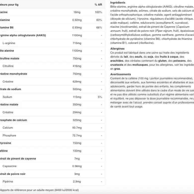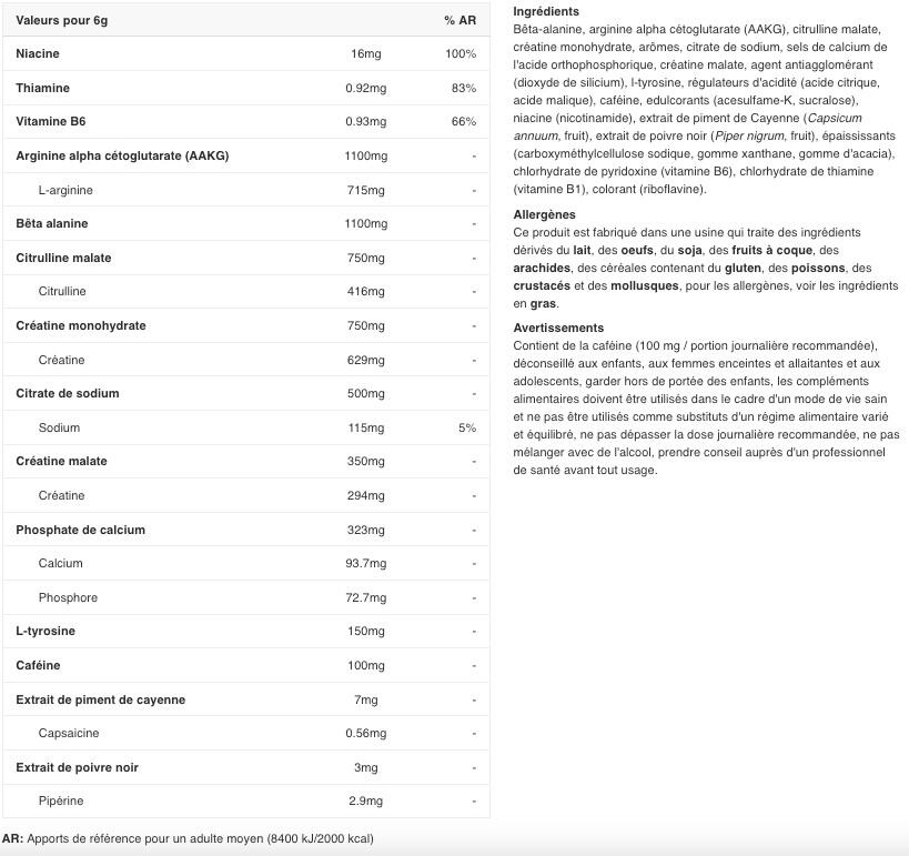 Super pre-workout recognized for its effectiveness, containing the main ingredients for muscle congestion and enriched with caffeine and vitamins for concentration and energy.