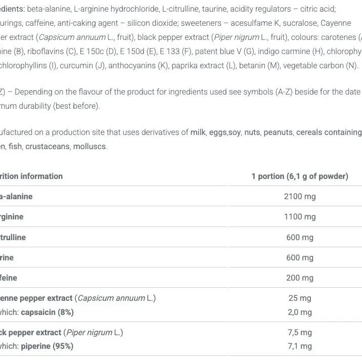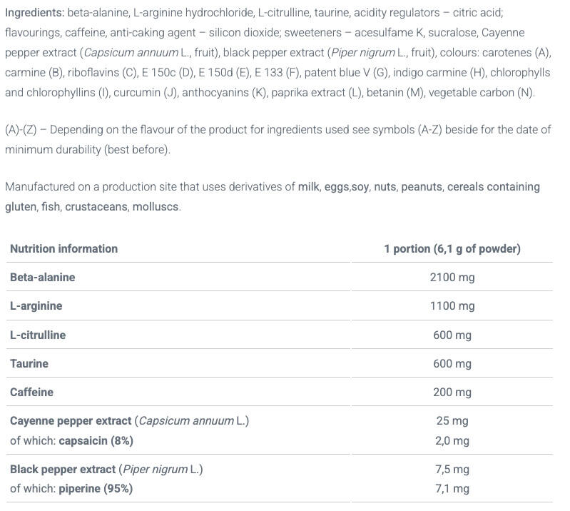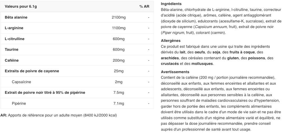Composed of beta-alanine, L-arginine and L-citrulline, it will improve your performance during your workout and give your muscles a nice post-workout pump.