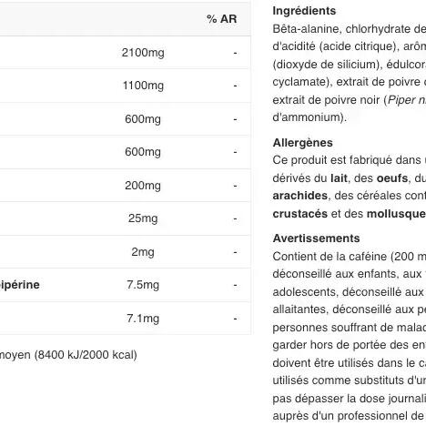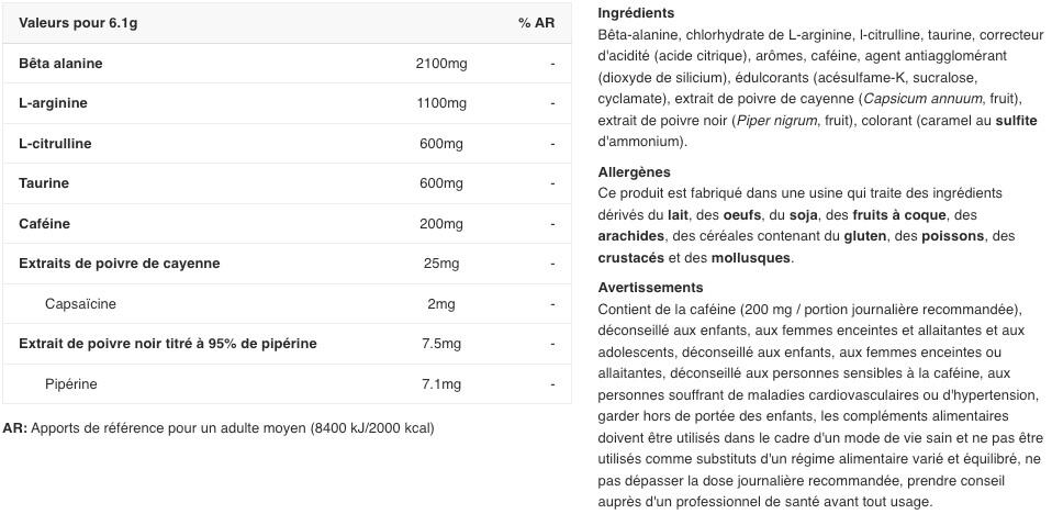 Composed of beta-alanine, L-arginine and L-citrulline, it will improve your performance during your workout and give your muscles a nice post-workout pump.