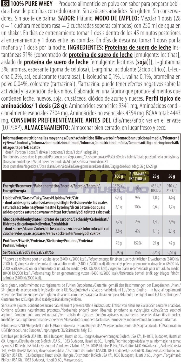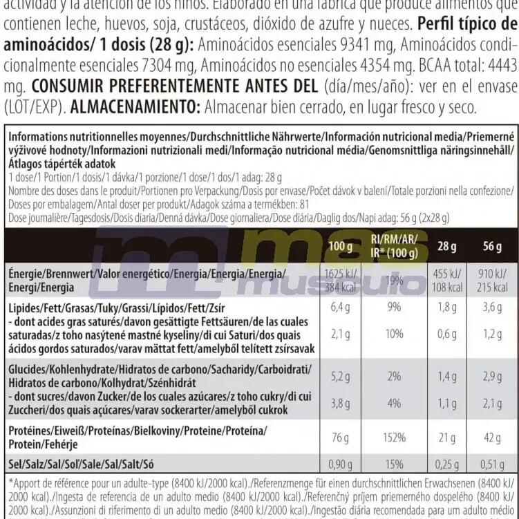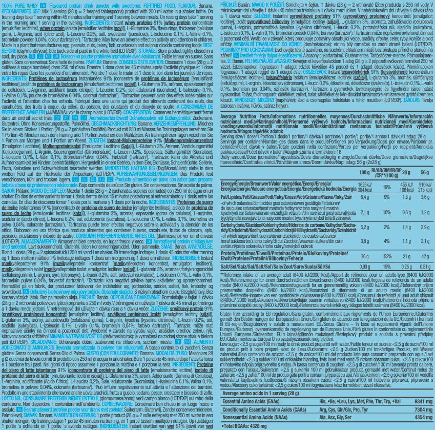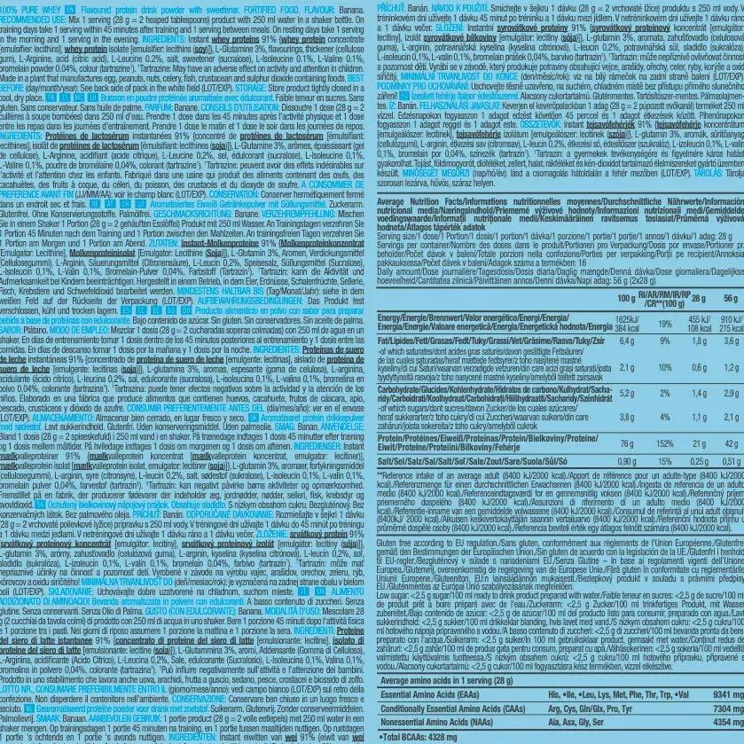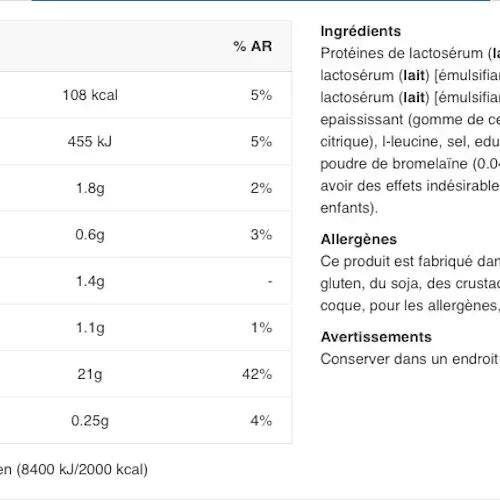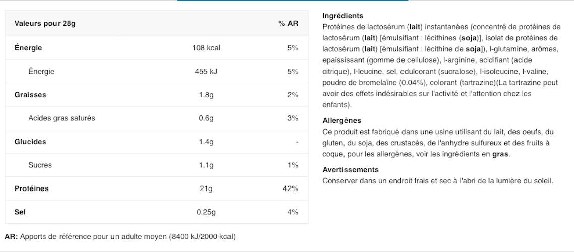 Chocolate ingredients: Instant whey protein 84% {whey protein concentrate [émulsifiant : lécithines], whey protein isolate [emulsifier : lecithin(soya)]}, low-fat cocoa powder, L-Glutamine 4.6%, flavourings, thickener (cellulose gel), L-Arginine, salt, L-Leucine 0.2%, sweetener (sucralose), L-Isoleucine 0.1%, L-Valine 0.1%, bromelain powder 0.04%.Ingredients Vanille Bourbon: Instant whey protein 92% {whey protein concentrate [émulsifiant : lécithines], whey protein isolate [emulsifier : lecithin(soya)]}, L-glutamine 3%, flavourings, thickener (cellulose gel), L-Arginine, L-Leucine 0.2%, salt, sweetener (sucralose), L-Isoleucine 0.1%, L-Valine 0.1%, bromelain powder 0.04%, color (tartrazine*).Ingredients Strawberry: Instant whey protein 89% {whey protein concentrate [émulsifiant : lécithines], whey protein isolate [emulsifier : lecithin(soya)]}, flavourings, L-glutamine 2.9%, thickener (cellulose gel), L-Arginine, acidifier (citric acid), salt, L-Leucine 0.2%, sweetener (sucralose), L-Isoleucine 0.1%, L-Valine 0.1%, bromelain powder 0.04%, color (Rouge allura AC*).Ingredients Banana: Instant whey protein 91% {whey protein concentrate [émulsifiant : lécithines], whey protein isolate [emulsifier : lecithin(soya)]}, L-Glutamine 3%, flavourings, thickener (cellulose gel), L-Arginine, acidifier (citric acid), L-Leucine 0.2%, salt, sweetener (sucralose), L-Isoleucine 0.1%, L-Valine 0.1%, bromelain powder 0.04%, color (tartrazine*).Ingredients Hazelnut: Instant whey protein 86% {whey protein concentrate [émulsifiant : lécithines], whey protein isolate [emulsifier : lecithins(soya)]}, low-fat cocoa powder, L-Glutamine 4.7%, L-Arginine, flavourings, thickener (cellulose gel), salt, L-Leucine 0.2%, sweetener (sucralose), L-Isoleucine 0.1%, L-Valine 0.1%, bromelain powder 0.04%.Cookie & creamingredients : Instant whey protein 90% {whey protein concentrate [émulsifiant : lécithines], whey protein isolate [emulsifier: lecithins(soya)]}, L-Glutamine 2.9%, flavourings, chocolate powder [cocoa mass, cocoa butter, low-fat cocoa powder, emulsifier: lecithin(soya), flavouring], L-Arginine, thickener (cellulose gel), cinnamon, salt, L-Leucine 0.2%, L-Isoleucine 0.1%, L-Valine 0.1%, sweetener (sucralose), bromelain powder 0.04%.Ingredients Coconut Chocolate: 86% instant whey protein {whey protein concentrate [émulsifiant : lécithines], whey protein isolate [emulsifier : lecithin(soya)]}, low-fat cocoa powder, L-Glutamine 4.7%, flavourings, L-Arginine, thickener (cellulose gel), salt, L-Leucine 0.2%, sweetener (sucralose), L-Isoleucine 0.1%, L-Valine 0.1%, bromelain powder 0.04%.Cookie ingredients: instant whey protein 91% {whey protein concentrate [émulsifiant : lécithines], whey protein isolate [emulsifier : lecithin(soya)]}, L-Glutamine 2.9%, flavoring, thickener (cellulose gel), L-Arginine, salt, colorants (ammonia caramel, tartrazine1 ), L-Leucine 0.2%, sweetener (sucralose), L-Isoleucine 0.1%, L-Valine 0.1%, bromelain powder 0.04%.Ingredients Chocolate Peanut Butter: instant whey protein 88% {whey protein concentrate [émulsifiant : lécithines], whey protein isolate [emulsifier : lecithins(soya)]}, L-Glutamine 2.9%, low-fat cocoa powder, flavourings, colourings (ammonia caramel), thickener (cellulose gel), L-Arginine, salt, L-Leucine 0.2%, sweetener (sucralose), L-Isoleucine 0.1%, L-Valine 0.1%, bromelain powder 0.04%.Ingredients Caramel Cappuccino: instant whey protein 87% {whey protein concentrate [émulsifiant : lécithines], whey protein isolate [emulsifier : lecithin(soya)]}, L-Glutamine 4.7%, low-fat cocoa powder, flavourings, L-Arginine, instant coffee 1%, thickener (cellulose gel), salt, L-Leucine 0.2%, sweetener (sucralose), L-Isoleucine 0.1%, L-Valine 0.1%, bromelain powder 0.04%.*Tartrazine may have adverse effects on activity and attention in children.**Red Allura AC may have adverse effects on activity and attention in children.