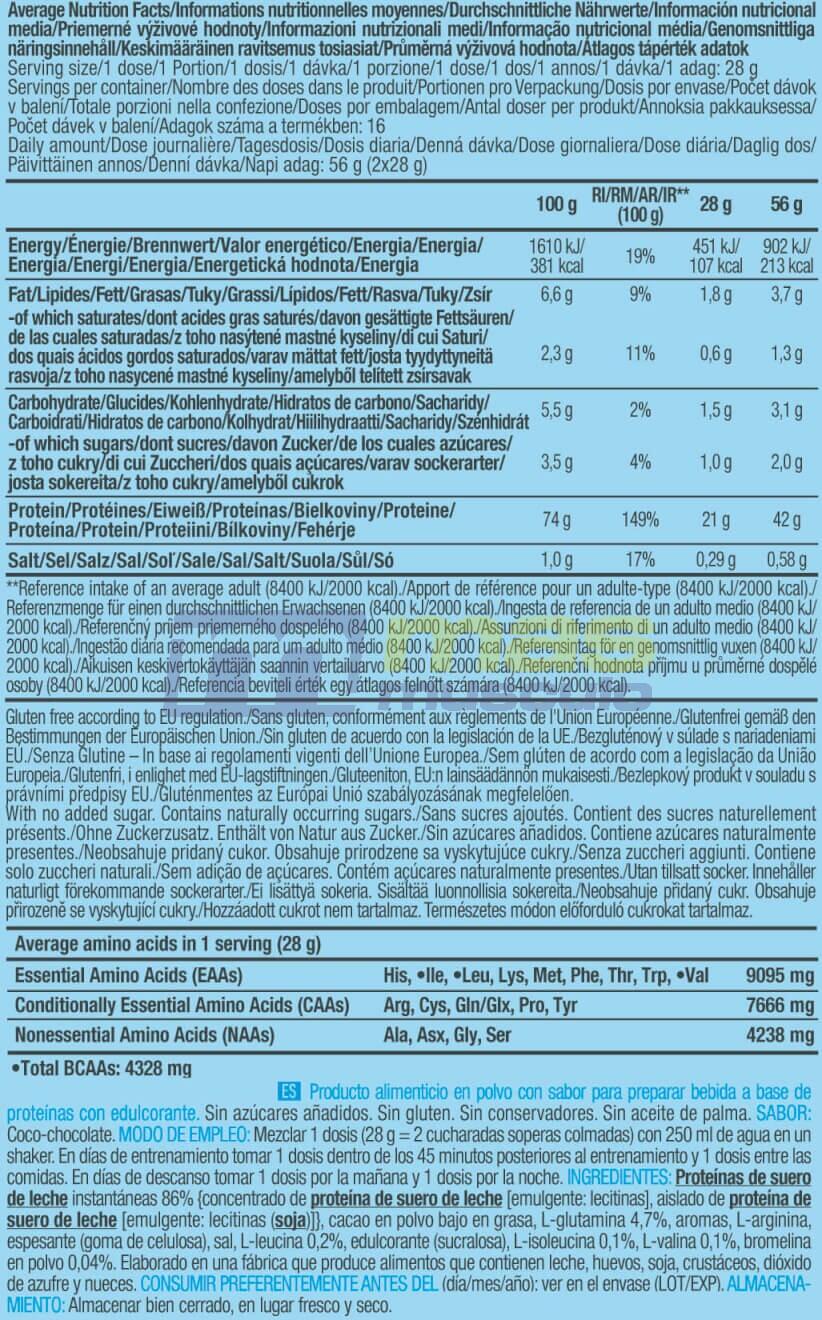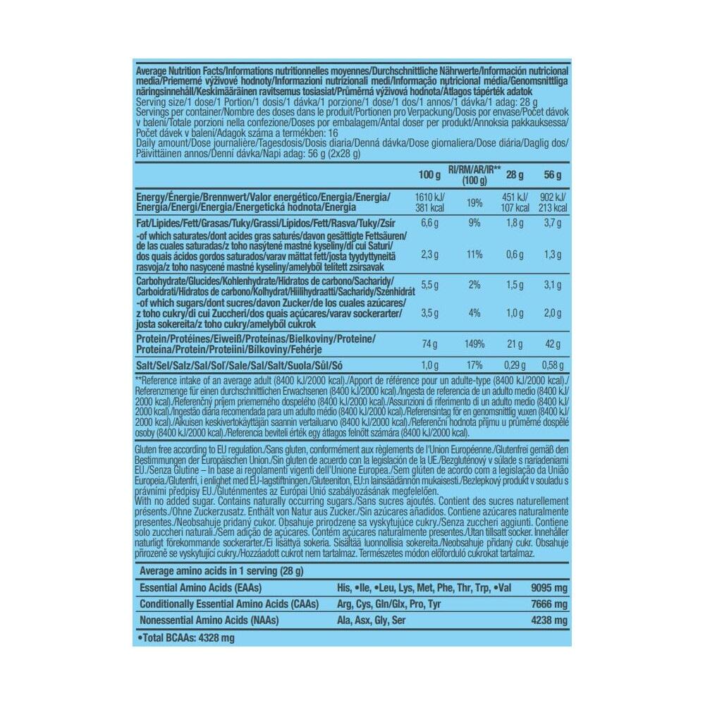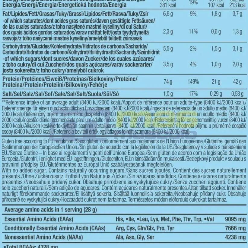100% PURE WHEYMOLKENPROTEIN-KOMPLEX MIT ZUSÄTZLICHEN AMINOSÄUREN UND SÜßUNGSMITTEL.ÜBERBLICKHoher Proteingehalt: 78 %6 g BCAA pro Portion***AspartamfreiOhne KonservierungsstoffeGroße GeschmacksauswahlAuch in nicht aromatisierter Version erhältlich*******Dieser Wert gilt für die aromatisierten Versionen; die nicht aromatisierte Version enthält 5 g BCAA pro Portion. ****Die nicht aromatisierte Version ist nur als 454-g-Packung erhältlich.VERWÖHN DEINE MUSKELNDie Versorgung deiner Muskeln mit hochwertigen Nährstoffen ist für eine normale Muskelfunktion, das Muskelwachstum und die Aufrechterhaltung der Muskeln von wesentlicher Bedeutung. Wie auch du mögen deine Muskeln „gut essen“. Verwöhne sie und dich mit dem köstlichen und cremigen 100 % Pure Whey Proteinpulver!WARUM 100 % PURE WHEY?Weil es ein Premium-Protein-Shake mit einem hohen BW (biologischem Wert) ist und 78 % des Proteingehalts vollständig aus Proteinquellen abgeleitet sind. 100 % Pure Whey ist in großer Geschmacksvielfalt erhältlich, es ist eine Zusammensetzung aus Molkenprotein-Konzentrat, Molkenprotein-Isolat und zusätzlichen Aminosäuren (L-Glutamin, L-Arginin und BCAAs). Die nicht aromatisierte Version enthält nur Molkenprotein-Konzentrat und enthält keine zugesetzten Süßungsmittel, Farbstoffe oder Aromen.Wähle 100 % Pure Whey, um deine Muskeln aufzuladen!1 Pro Portion (28 g):22 g Protein6 g BCAA******Dieser Wert gilt für die aromatisierten Versionen; die nicht aromatisierte Version enthält 5 g BCAA pro Portion. Geschmacksrichtung: Haselnuss: Molkenproteine (Konzentrat, Isolat), fettarmes Kakaopulver, L-Glutamine, Verdickungsmittel (Cellulosegummi), Aromen, L-Arginin, Füllmittel für Cremigkeit [teilweis hydriertes Kokosfett, Magermilchpulver, Emulgatoren (E471, E472a), Glukosesirup, Saccharose, Milchprotein, Stabilisator (Kaliumphosphaten), Trennmittel (Calciumphosphate)], Speisesalz, Emulgator: Lecithine (Soja), L-Leucin, L-Isoleucin, L-Valin, Süßungsmittel (Sucralose).Geschmacksrichtung: Banane: Molkenproteine (Konzentrat, Isolat) Füllmittel für Cremigkeit [teilweise hydriertes Kokosfett, Magermilchpulver, Emulgator (E471, E472a), Glukosesirup, Saccharose, Milchprotein, Stabilisator (Kaliumphosphat),Trennmittel(Calciumphosphat)], L-Glutamin, Aromen, Verdickungsmittel (Cellulosegummi), L-Arginin, Säuerungsmittel (Zitronensäure), L-Leucin, Speisesalz, Süßungsmittel (Sucralose), L-Isoleucin, L-Valin, Farbstoffe (Tartrazin)*.Geschmacksrichtung: Karamell-Cappuccino: Molkenprotein (Konzentrat, Isolat), Füllmittel für Cremigkeit [teilweise hydriertes Kokosfett, Magermilchpulver, Emulgator (E471,E472a), Glukosesirup, Saccharose, Milcheiweiß, Stabilisator (Kaliumphosphat),Trennmittel (Calciumphosphat)],L-Glutamine, fettarmes Kakaopulver, Verdickungsmittel (Cellulosegummi), Aromen, Instant-Kaffee, L-Arginine, Salz, L-Leucin, Emulgator: Lecithine (Soja), L-Isoleucin, L-Valin, Süßungsmittel (Sucralose).Geschmacksrichtung: Schokolade: Molkenprotein (Konzentrat,Isolat), fettarmes Kakaopulver, L-Glutamine, Aromen, Füllmittel für Cremigkeit [teilweise hydriertes Kokosfett, Magermilchpulver, Emulgator (E471,E472a), Glukosesirup, Saccharose, Milcheiweiß, Stabilisator (Kaliumphosphat),Trennmittel (Calciumphosphat)], Verdickungsmittel (Cellulosegummi), L-Aginine, Salz, L-Leucin, Emulgator: Lecithine (Soja), Süßungsmittel (Sucralose), L-Isoleucin, L-ValinGeschmacksrichtung: Erdbeere: Molkenprotein (Konzentrat, Isolat), L-Glutamin, Aroma, Verdickungsmittel (Cellulosegummi), Füllmittel für Cremigkeit [teilweise hydriertes Kokosfett, Magermilchpulver, Emulgator (E471, E472a), Glukosesirup, Saccharose, Milchweiß, Stabilisator (Kaliumpho