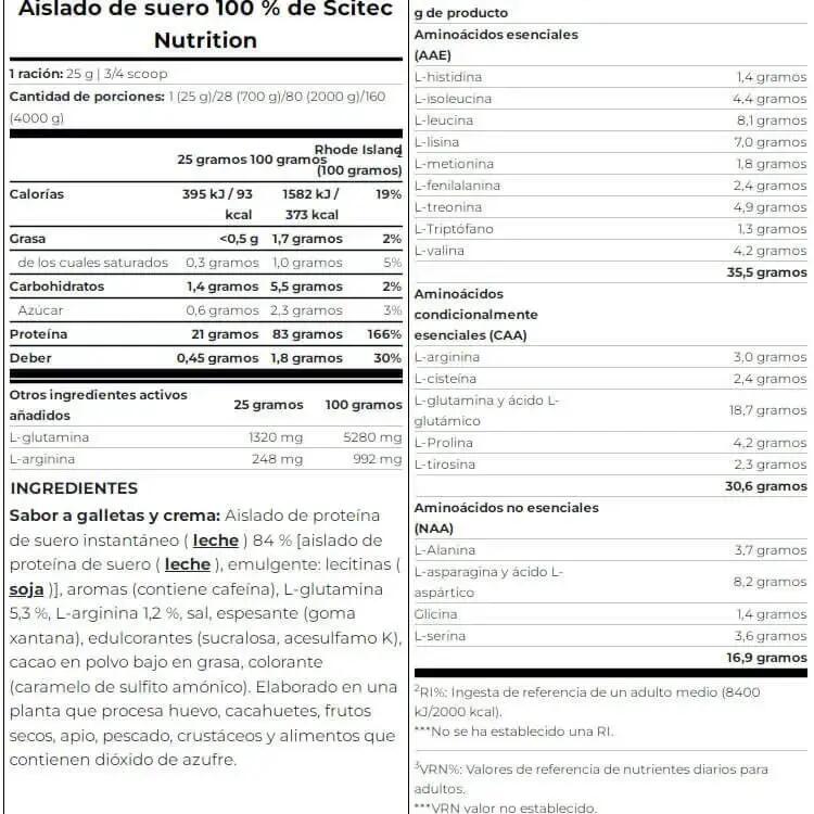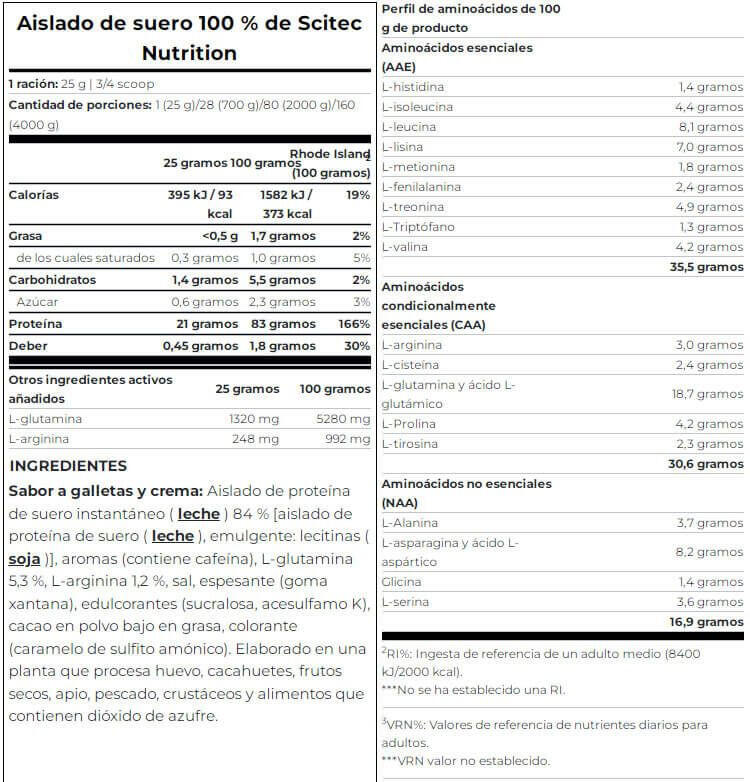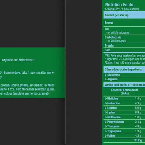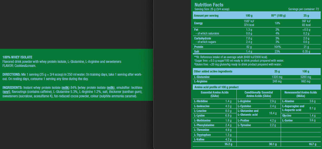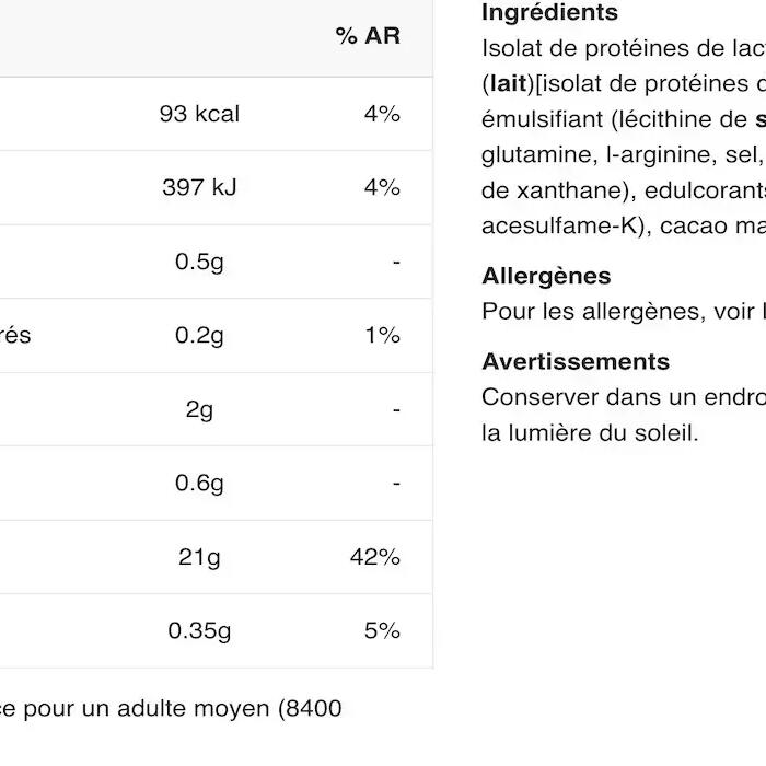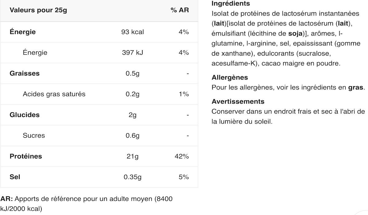 Ingredients Salted Caramel: instant whey protein isolate (milk)[isolat de protéines de lactosérum (lait), émulsifiant (lécithine de soja)], l-glutamine, flavourings, salt, l-arginine, thickener (xanthan gum), color (ammoniacal caramel), sweeteners (sucralose, acesulfame-K).Cookies & Cream ingredients: instant whey protein isolate (milk)[isolat de protéines de lactosérum (lait), émulsifiant (lécithine de soja)], flavourings, l-glutamine, l-arginine, salt, thickener (xanthan gum), sweeteners (sucralose, acesulfame-K), low-fat cocoa powder.Ingredients Raspberry: instant whey protein isolate (milk)[isolat de protéines de lactosérum (lait), émulsifiant (lécithine de soja)], l-glutamine, flavourings, l-arginine, acidifier (malic acid), salt, thickener (xanthan gum), sweeteners (sucralose, acesulfame-K), color (Ponceau 4R).Ingredients Strawberry: instant whey protein isolate (milk)[isolat de protéines de lactosérum (lait), émulsifiant (lécithine de soja)], flavourings, l-glutamine, l-arginine, salt, beet juice powder (maltodextrin, red beet juice concentrate, acidity regulator: citric acid), thickener (xanthan gum), sweeteners (sucralose, acesulfame-K), acidifier (malic acid).Ingredients Chocolate: instant whey protein isolate (milk)[isolat de protéines de lactosérum (lait), émulsifiant (lécithine de soja)], l-glutamine, low-fat cocoa powder, flavouring, l-arginine, salt, thickener (xanthan gum), sweeteners (sucralose, acesulfame-K).Ingredients Vanilla: instant whey protein isolate (milk)[isolat de protéines de lactosérum (lait), émulsifiant (lécithine de soja)], flavouring, l-glutamine, l-arginine, salt, yoghurt powder (milk), thickener (xanthan gum), sweeteners (sucralose, acesulfame-K).Ingredients Banana: instant whey protein isolate 84% [isolat de protéines de lactosérum (lait), émulsifiant (lécithine de soja)], l-glutamine 5.3%, yoghurt powder (milk), l-arginine 1.2%, salt, thickener (xanthan gum), acidifier (malic acid), sweeteners (sucralose, acesulfame-K).Ingredients Pistachio: instant whey protein isolate 86% (milk) [isolat de protéines de lactosérum (lait), émulsifiant (lécithine de soja)], flavourings, l-glutamine 5.3%, L-arginine 1.2%, salt, thickener (xanthan gum), sweeteners (sucralose, acesulfame-K), color (ammoniacal caramel, copper complexes of chlorophylls and chlorophyllines, riboflavins).Ingredients Chocolat Noisette: instant whey protein isolate (milk)[isolat de protéines de lactosérum (lait), émulsifiant (lécithine de soja)], l-glutamine, flavourings, low-fat cocoa powder, l-arginine, salt, thickener (xanthan gum), sweeteners (sucralose, acesulfame-K).