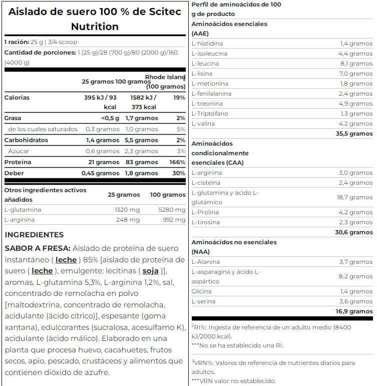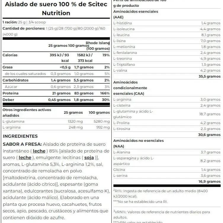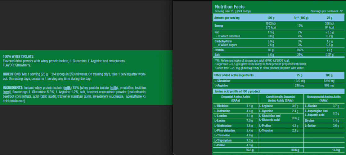 Scitec Nutrition's 100% Whey Isolate is a pure, sugar-free, gluten-free whey protein isolate with added L-glutamine and L-arginine.
