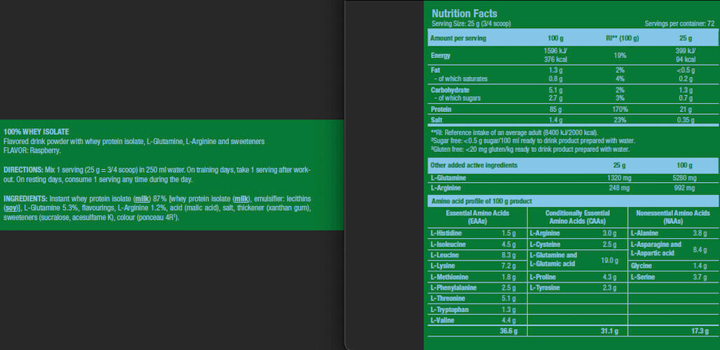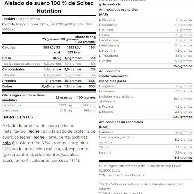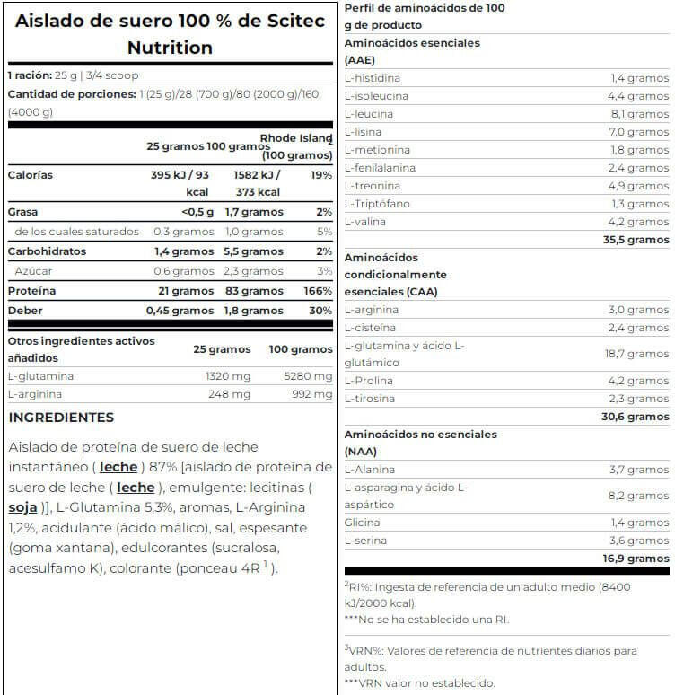 Scitec Nutrition's 100% Whey Isolate is a pure, sugar-free, gluten-free whey protein isolate with added L-glutamine and L-arginine.