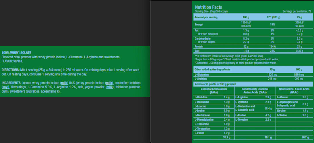 Scitec Nutrition's 100% Whey Isolate is a pure, sugar-free, gluten-free whey protein isolate with added L-glutamine and L-arginine.