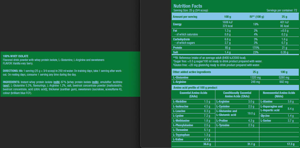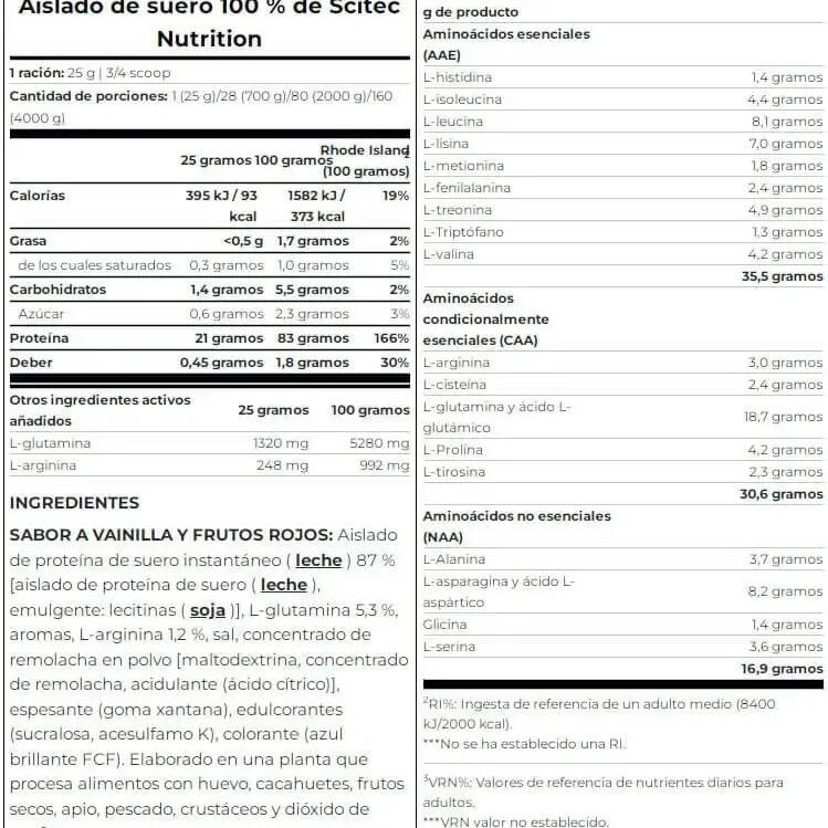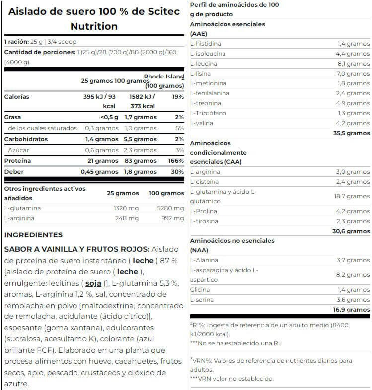 Scitec Nutrition's 100% Whey Isolate is a pure, sugar-free, gluten-free whey protein isolate with added L-glutamine and L-arginine.