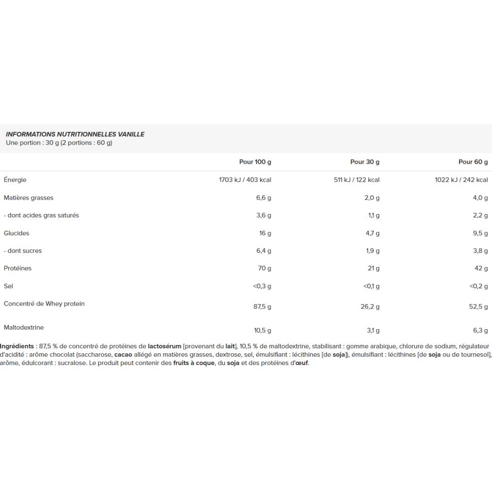 Whey Protein (2270g) from Allnutrition is a high-quality whey protein formula designed to help you easily incorporate more protein into your daily diet, whether you're athletic, active or simply concerned about your nutritional well-being.Derived from whey protein concentrate (WPC), this supplement provides you with around 21 g of protein per serving, with a complete amino acid profile ly present in protein. It's ideal for post-workout snacks, breakfast or any time of day when you need a quick, easily digestible protein boost.Thanks to its creamy texture and perfect miscibility, this whey mixes easily with water or plant milk, without lumps or unpleasant aftertaste. It's available in several ultra gourmet flavors: Chocolate, Vanilla, Chocolate Hazelnut and Chocolate Dubai...enough to indulge you with every shaker, without frustration.With a low sugar and fat content, this formula fits perfectly into a healthy, balanced routine, whether you're in a controlled mass gain or a lean period. Its nutritional profile makes it ideal if you simply want to increase your protein intake, support your muscle tone or avoid cravings.