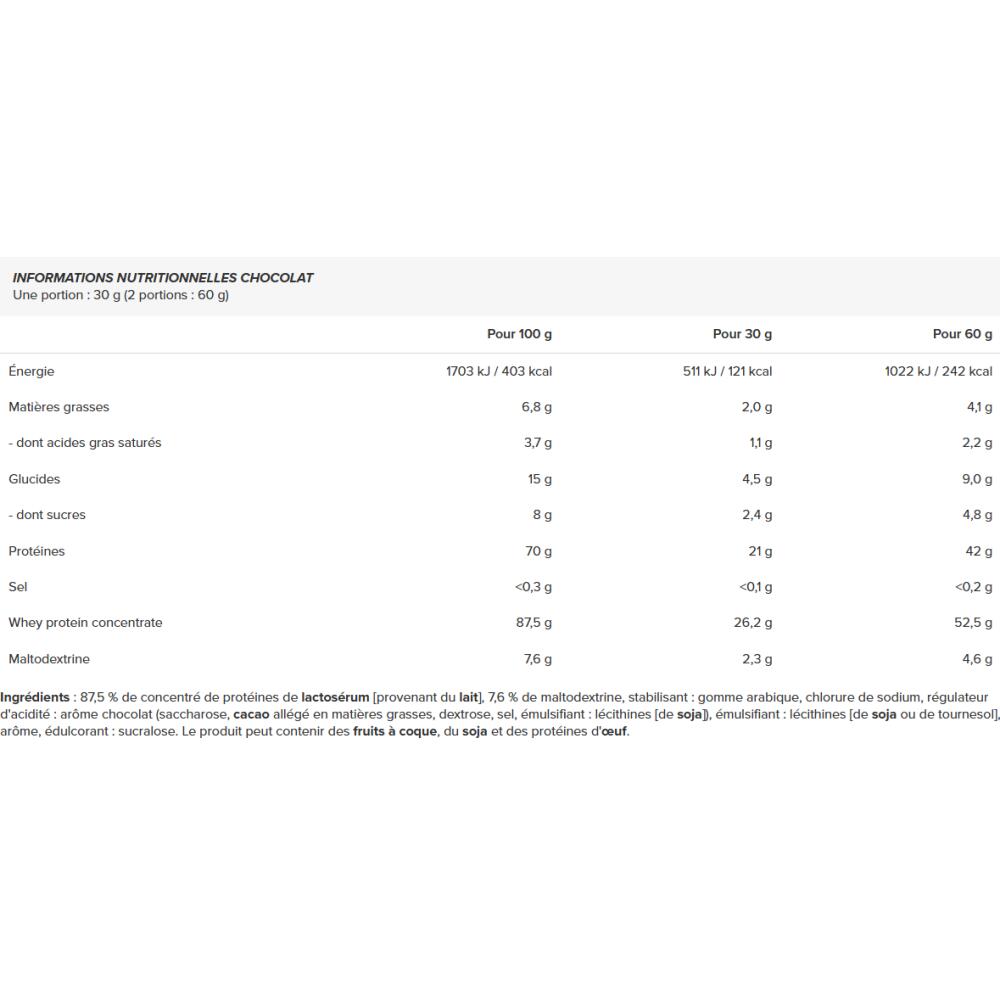 Whey Protein (2270g) from Allnutrition is a high-quality whey protein formula designed to help you easily incorporate more protein into your daily diet, whether you're athletic, active or simply concerned about your nutritional well-being.Derived from whey protein concentrate (WPC), this supplement provides you with around 21 g of protein per serving, with a complete amino acid profile ly present in protein. It's ideal for post-workout snacks, breakfast or any time of day when you need a quick, easily digestible protein boost.Thanks to its creamy texture and perfect miscibility, this whey mixes easily with water or plant milk, without lumps or unpleasant aftertaste. It's available in several ultra gourmet flavors: Chocolate, Vanilla, Chocolate Hazelnut and Chocolate Dubai...enough to indulge you with every shaker, without frustration.With a low sugar and fat content, this formula fits perfectly into a healthy, balanced routine, whether you're in a controlled mass gain or a lean period. Its nutritional profile makes it ideal if you simply want to increase your protein intake, support your muscle tone or avoid cravings.