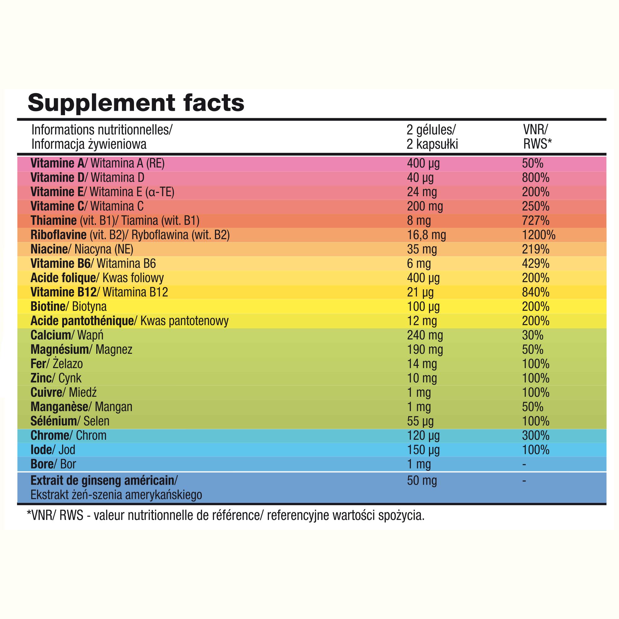 NUTRITIONAL INFORMATION Serving size: 2 capsules For 2 capsules VNR Vitamin A (RE) 400 µg 50% Vitamin D 40 µg 800% Vitamin E 24 mg 24% Vitamin C 200 mg 250 Thiamine (vit. B1) 8 mg 727 Riboflavin (vit. B2) 16.8 mg 1200 Niacin (NE) 35 mg 219 Vitamin B6 6 mg 429 Folic acid 400 µg 200 Vitamin B12 21 µg 840 Biotin 100 µg 200 Pantothenic acid 12 mg 200 Calcium 240 mg 30% Magnesium 190 mg 50% Iron 14 mg 100% Zinc 10 mg 100% Copper 1 mg 100% Manganese 1 mg 50% Selenium 55 µg 100% Chromium 120 µg 300 Iodine 150 µg 100% Boron 1 mg - American ginseng extract 50 mg -