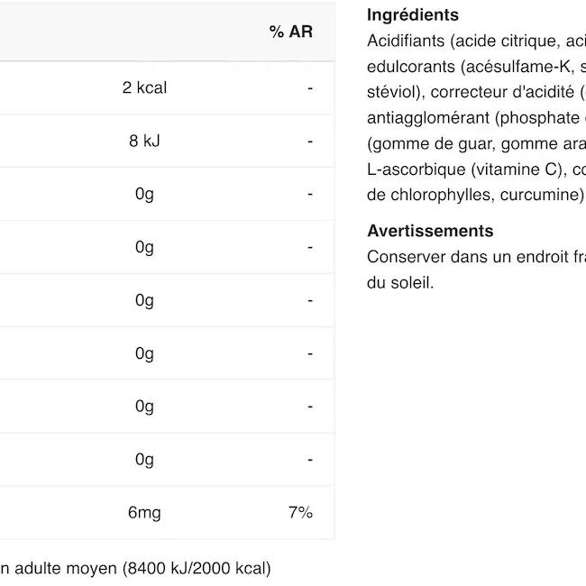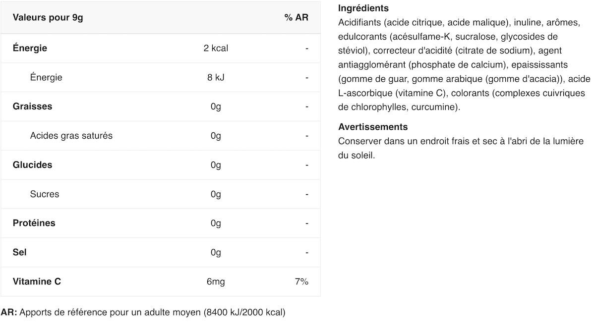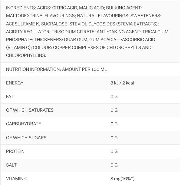 acids( citric acid, malic acid), maltodextrin, flavourings, sweeteners( acesulfame K, sucralose, steviol glycosides from stevia), acidity regulator( sodium citrate), anti-caking agent( calcium phosphates), thickener( guar gum, gum arabic), L-ascorbic acid( Vitamin C), colours( copper complexes of chlorophylls and chlorophyllins)