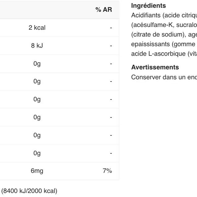 acids( citric acid, malic acid), maltodextrin, flavourings, sweeteners( acesulfame K, sucralose, steviol glycosides from stevia), acidity regulator( sodium citrate), anti-caking agent( calcium phosphates), thickener( guar gum, gum arabic), L-ascorbic acid( Vitamin C), colours( carrot concentrate)