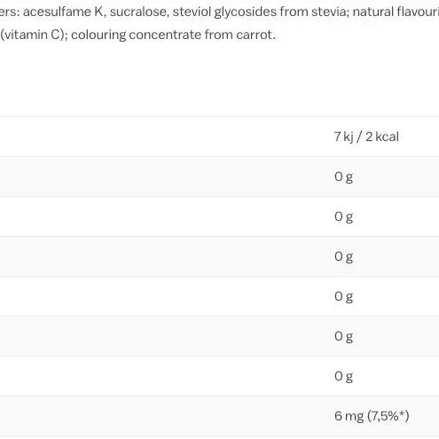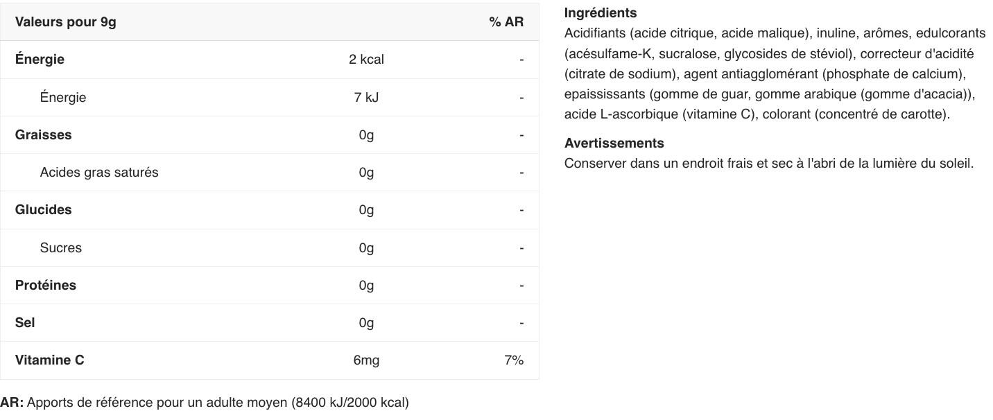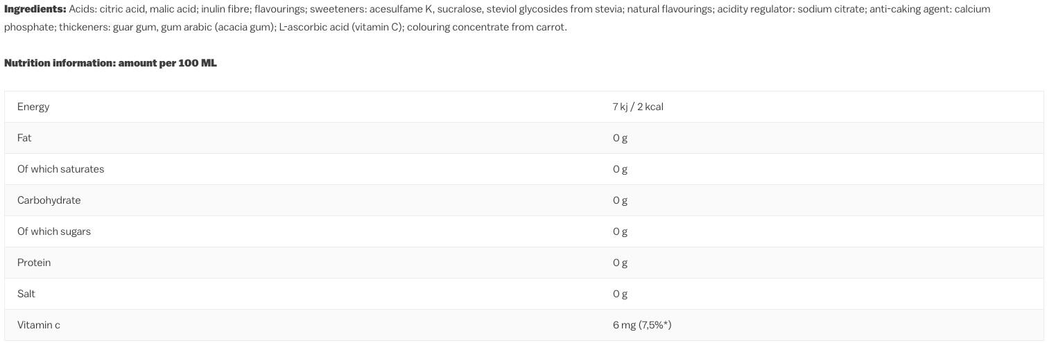 acids( citric acid, malic acid), maltodextrin, flavourings, sweeteners( acesulfame K, sucralose, steviol glycosides from stevia), acidity regulator( sodium citrate), anti-caking agent( calcium phosphates), thickener( guar gum, gum arabic), L-ascorbic acid( Vitamin C), colours( carrot concentrate)