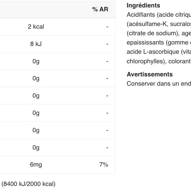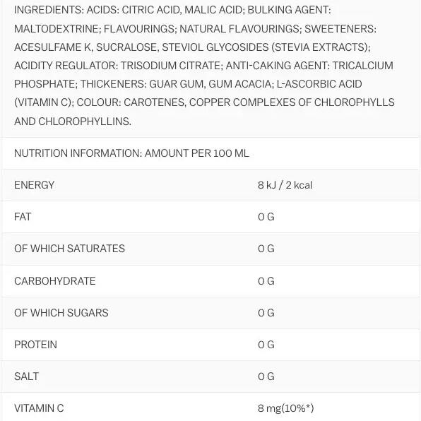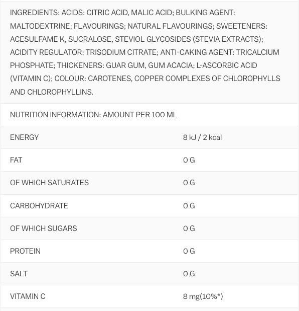 acids( citric acid, malic acid), maltodextrin, flavourings, sweeteners( acesulfame K, sucralose, steviol glycosides from stevia), acidity regulator( sodium citrate), anti-caking agent( calcium phosphates), thickener( guar gum, gum arabic), L-ascorbic acid( Vitamin C), colours( copper complexes of chlorophylls and chlorophyllins, beta-carotene)