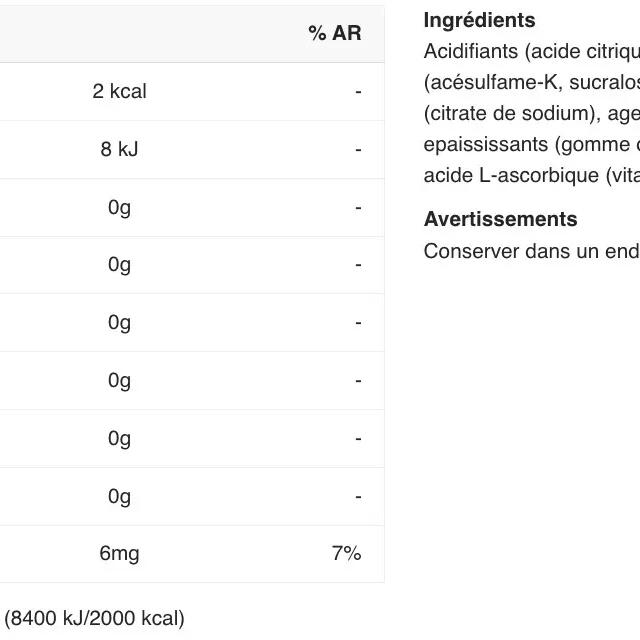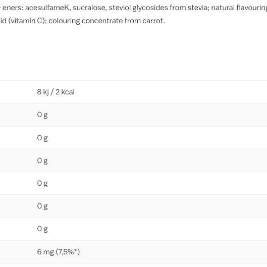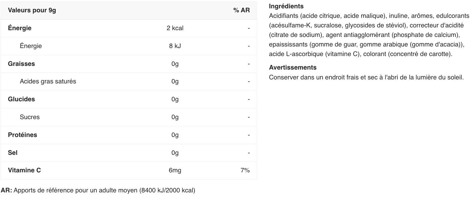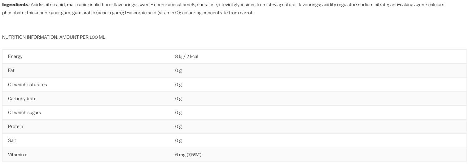 acids( citric acid, malic acid), maltodextrin, flavourings, sweeteners( acesulfame K, sucralose, steviol glycosides from stevia), acidity regulator( sodium citrate), anti-caking agent( calcium phosphates), thickener( guar gum, gum arabic), L-ascorbic acid( Vitamin C), colours( carrot concentrate)