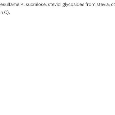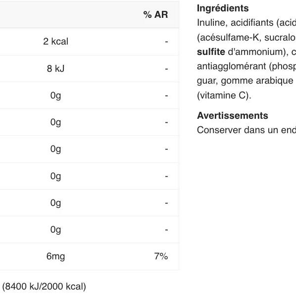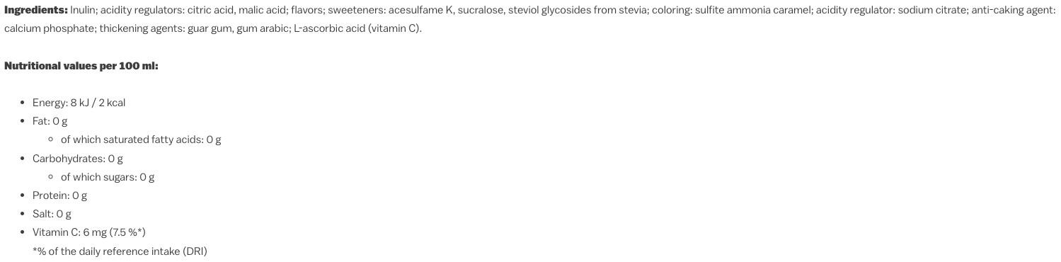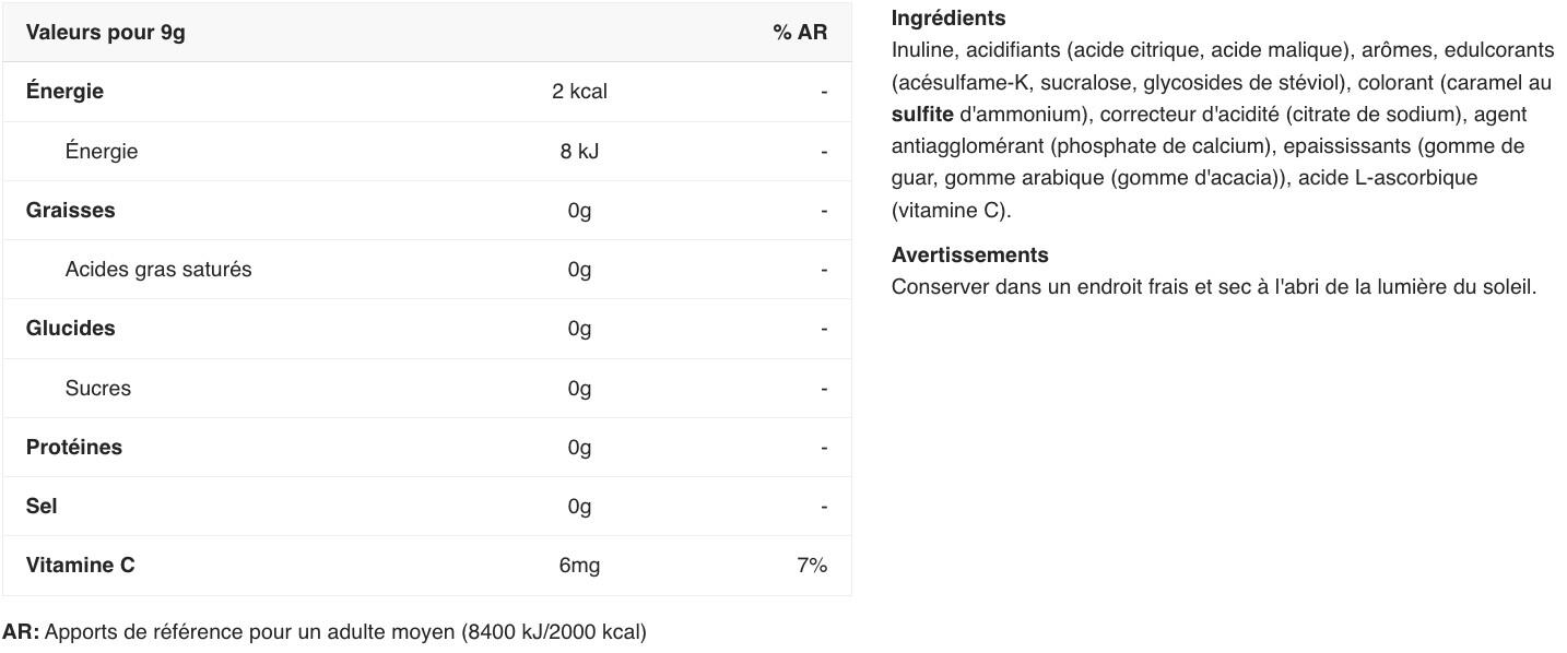 inulin fibre, acids( citric acid, malic acid), flavourings, sweeteners( acesulfame K, sucralose, steviol glycosides from stevia), colour( SULPHITE AMMONIA CARAMEL), acidity regulator( sodium citrate), anti-caking agent( calcium phosphates), thickeners( guar gum, acacia gum), ascorbic acid( Vitamin C)
