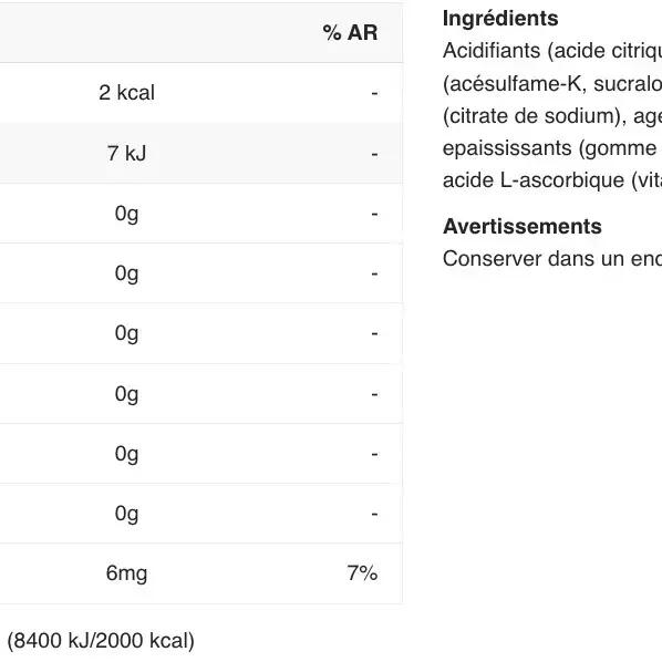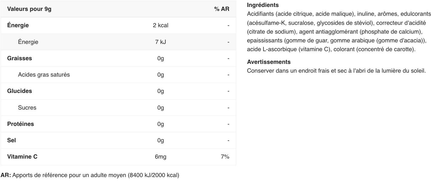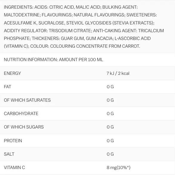 acids( citric acid, malic acid), maltodextrin, flavourings, sweeteners( acesulfame K, sucralose, steviol glycosides from stevia), acidity regulator( sodium citrate), anti-caking agent( calcium phosphates), thickener( guar gum, gum arabic), L-ascorbic acid( Vitamin C), colours( carrot concentrate)