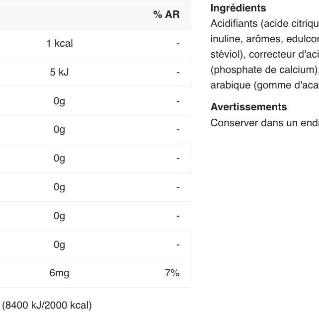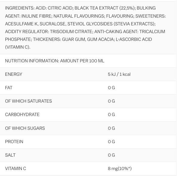 acids( citric acid), black tea extract(22,5%), maltodextrin, flavourings, sweeteners( acesulfame K, sucralose, steviol glycosides from stevia), acidity regulator( sodium citrate), anti-caking agent( calcium phosphates), thickener( guar gum, gum arabic), L-ascorbic acid( Vitamin C)