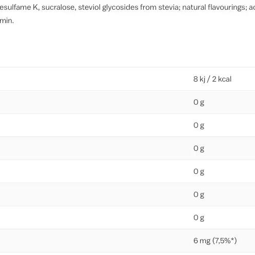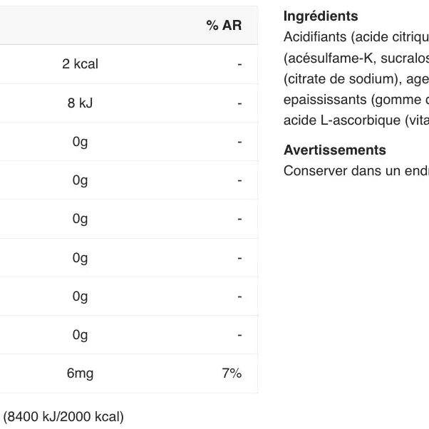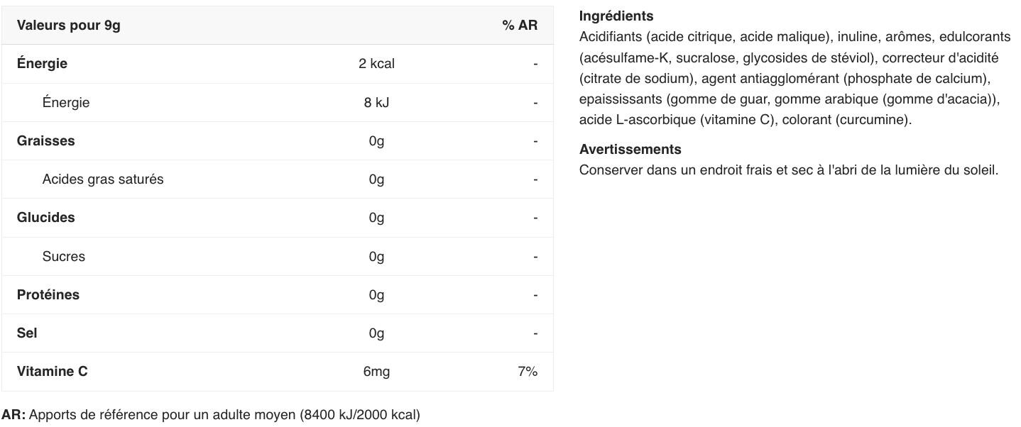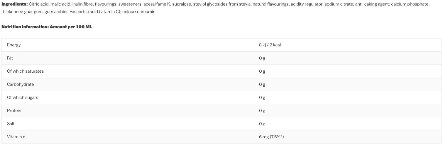 acids( citric acid, malic acid), maltodextrin, flavourings, sweeteners( acesulfame K, sucralose, steviol glycosides from stevia), acidity regulator( sodium citrate), anti-caking agent( calcium phosphates), thickener( guar gum, gum arabic), L-ascorbic acid( Vitamin C), colours( curcumin)