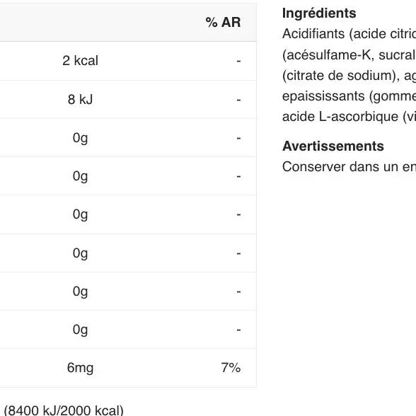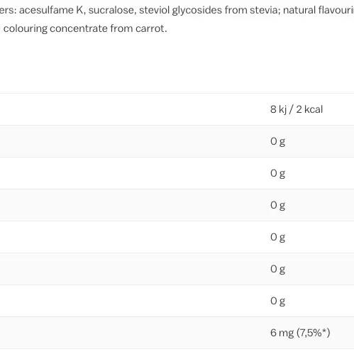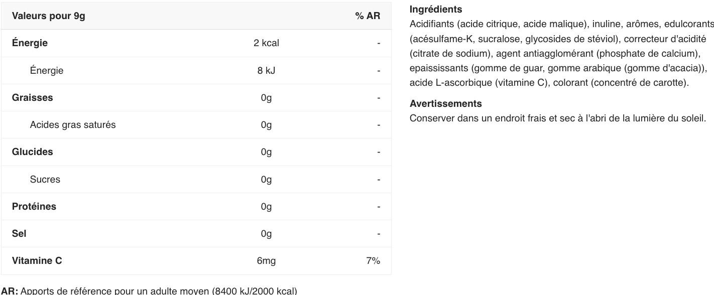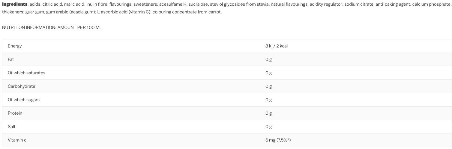 acids( citric acid, malic acid), maltodextrin, flavourings, sweeteners( acesulfame K, sucralose, steviol glycosides from stevia), acidity regulator( sodium citrate), anti-caking agent( calcium phosphates), thickener( guar gum, gum arabic), L-ascorbic acid( Vitamin C), colours( carrot concentrate)
