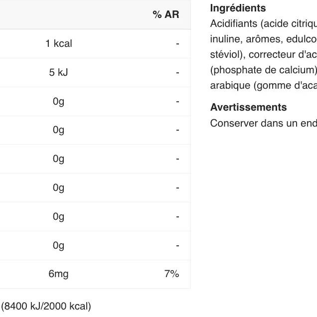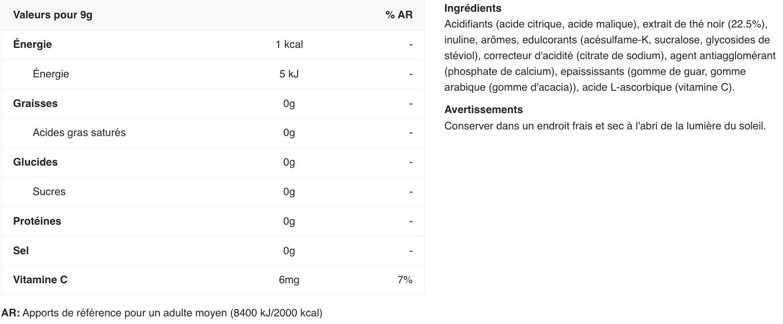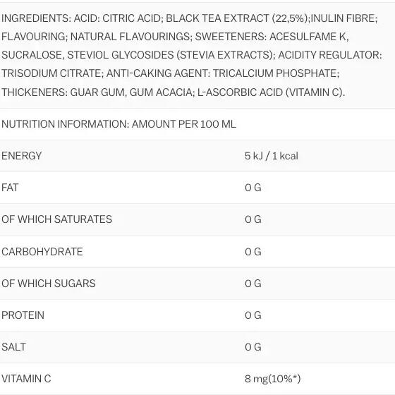 acids( citric acid), black tea extract(22,5%), maltodextrin, flavourings, sweeteners( acesulfame K, sucralose, steviol glycosides from stevia), acidity regulator( sodium citrate), anti-caking agent( calcium phosphates), thickener( guar gum, gum arabic), L-ascorbic acid( Vitamin C)