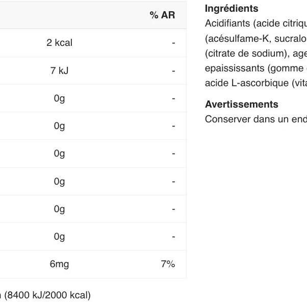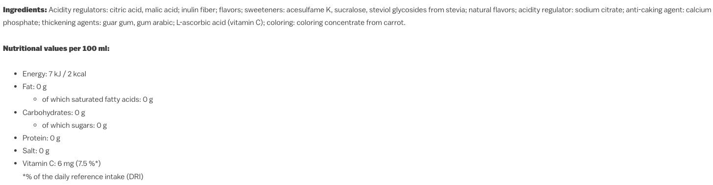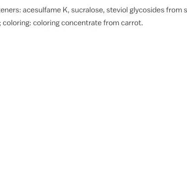 acids( citric acid, malic acid), maltodextrin, flavourings, sweeteners( acesulfame K, sucralose, steviol glycosides from stevia), acidity regulator( sodium citrate), anti-caking agent( calcium phosphates), thickener( guar gum, gum arabic), L-ascorbic acid( Vitamin C), colours( carrot concentrate)