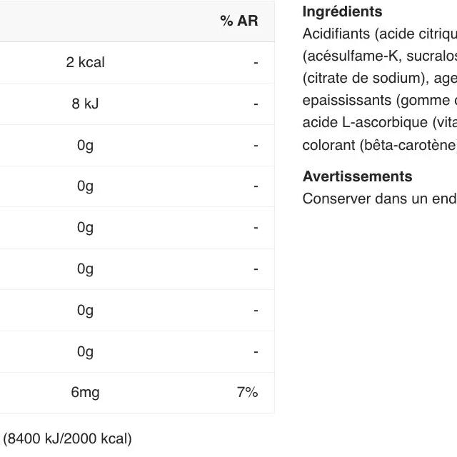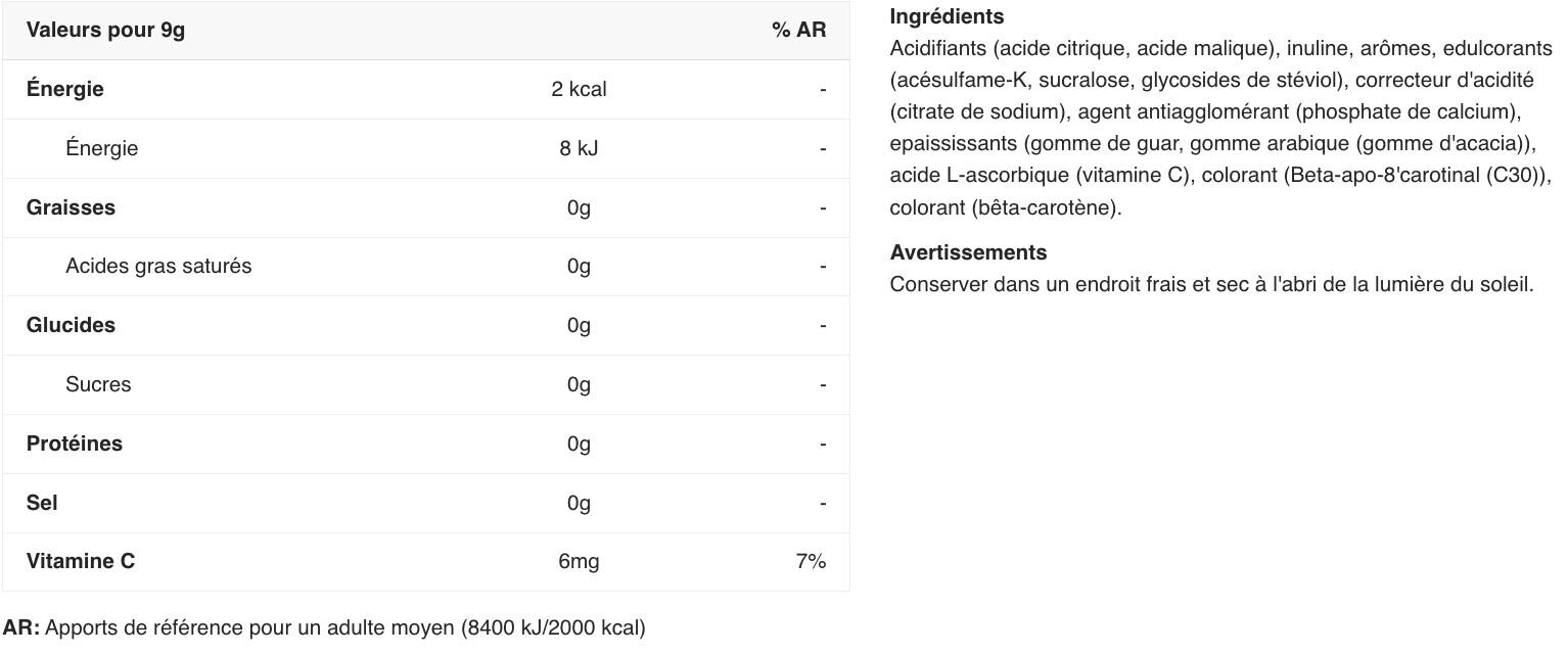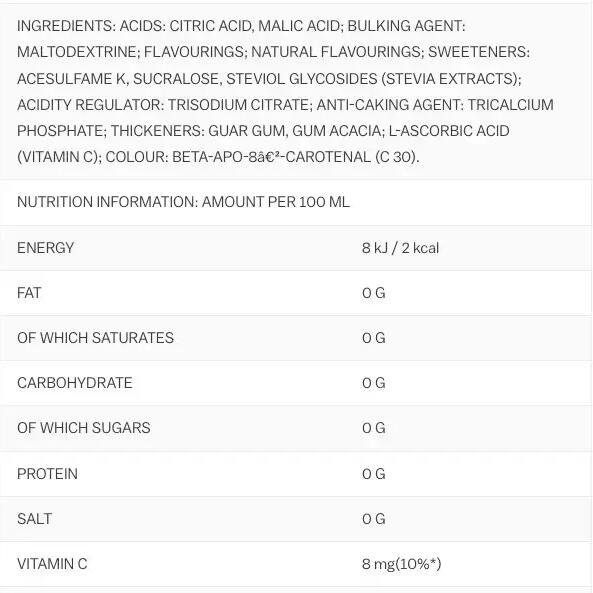 acids( citric acid, malic acid), maltodextrin, flavourings, sweeteners( acesulfame K, sucralose, steviol glycosides from stevia), acidity regulator( sodium citrate), anti-caking agent( calcium phosphates), thickener( guar gum, gum arabic), L-ascorbic acid( Vitamin C), colours( beta-apo-8'-carotenal (C30))