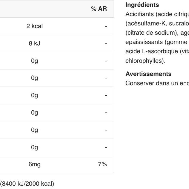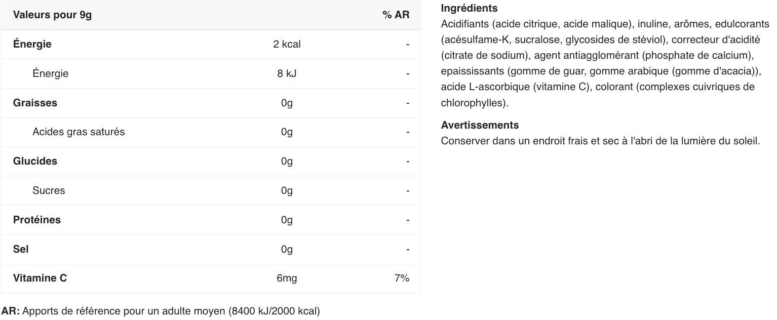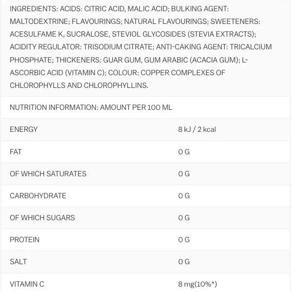 acids( citric acid, malic acid), maltodextrin, flavourings, sweeteners( acesulfame K, sucralose, steviol glycosides from stevia), acidity regulator( sodium citrate), anti-caking agent( calcium phosphates), thickener( guar gum, gum arabic), L-ascorbic acid( Vitamin C), colours( copper complexes of chlorophylls and chlorophyllins)