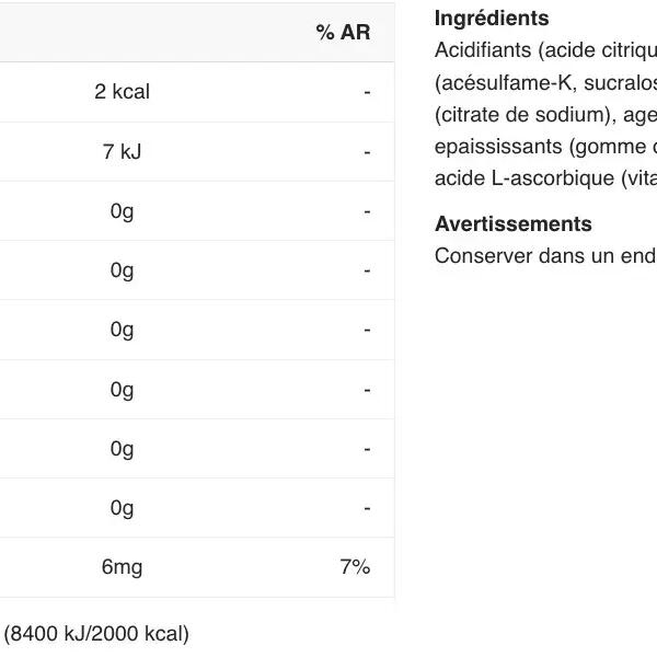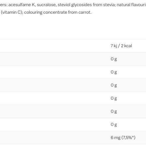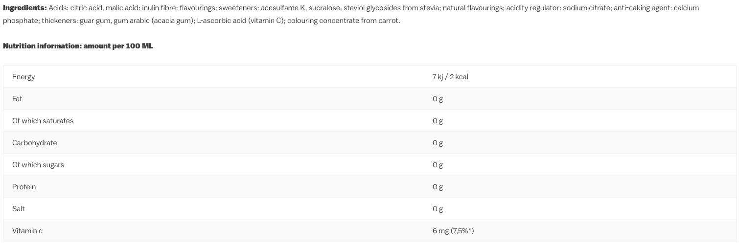 acids( citric acid, malic acid), maltodextrin, flavourings, sweeteners( acesulfame K, sucralose, steviol glycosides from stevia), acidity regulator( sodium citrate), anti-caking agent( calcium phosphates), thickener( guar gum, gum arabic), L-ascorbic acid( Vitamin C), colours( carrot concentrate)